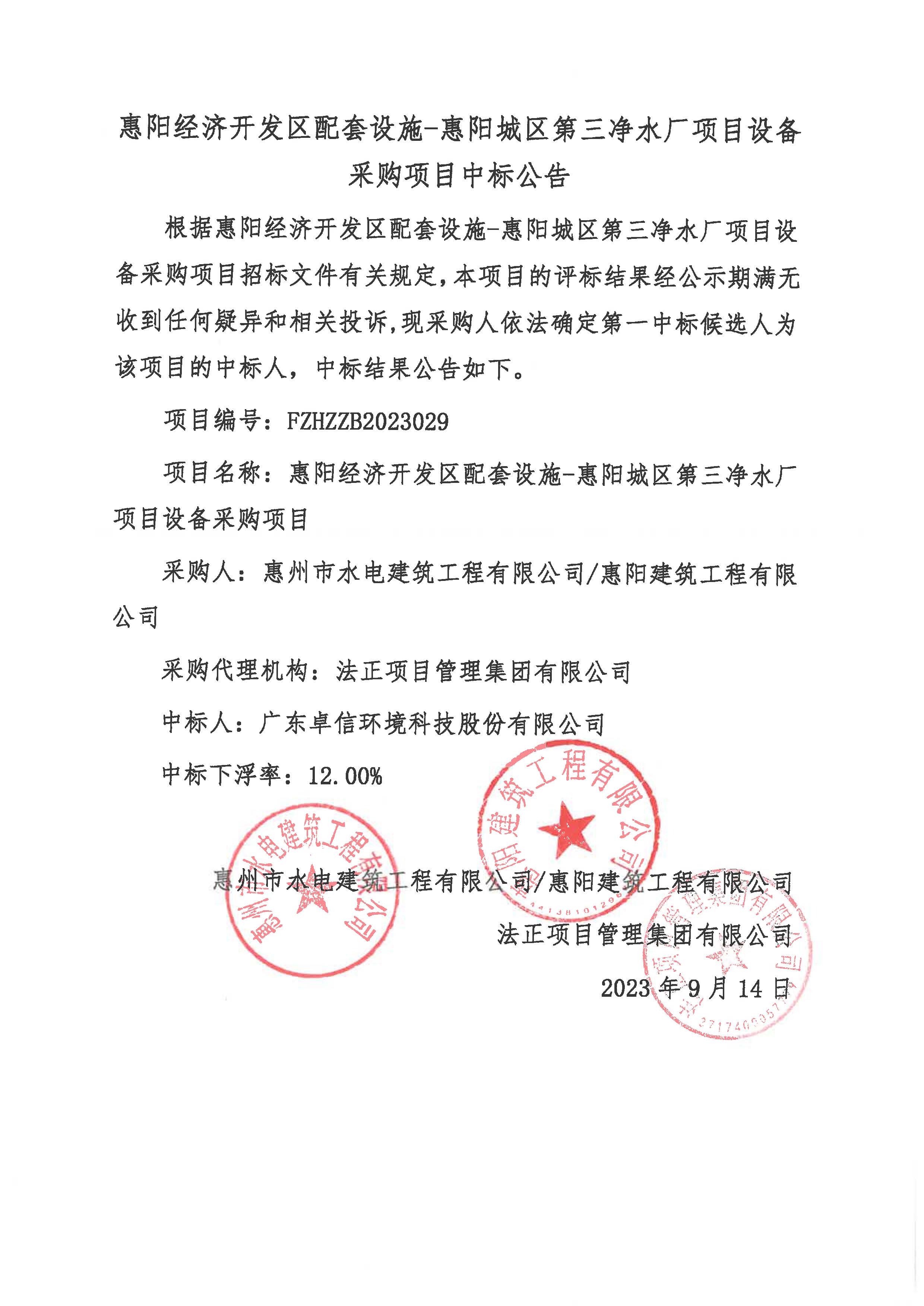 惠陽經(jīng)濟開發(fā)區(qū)配套設(shè)施——惠陽城區(qū)第三凈水廠項目設(shè)備采購項目中標(biāo)公告