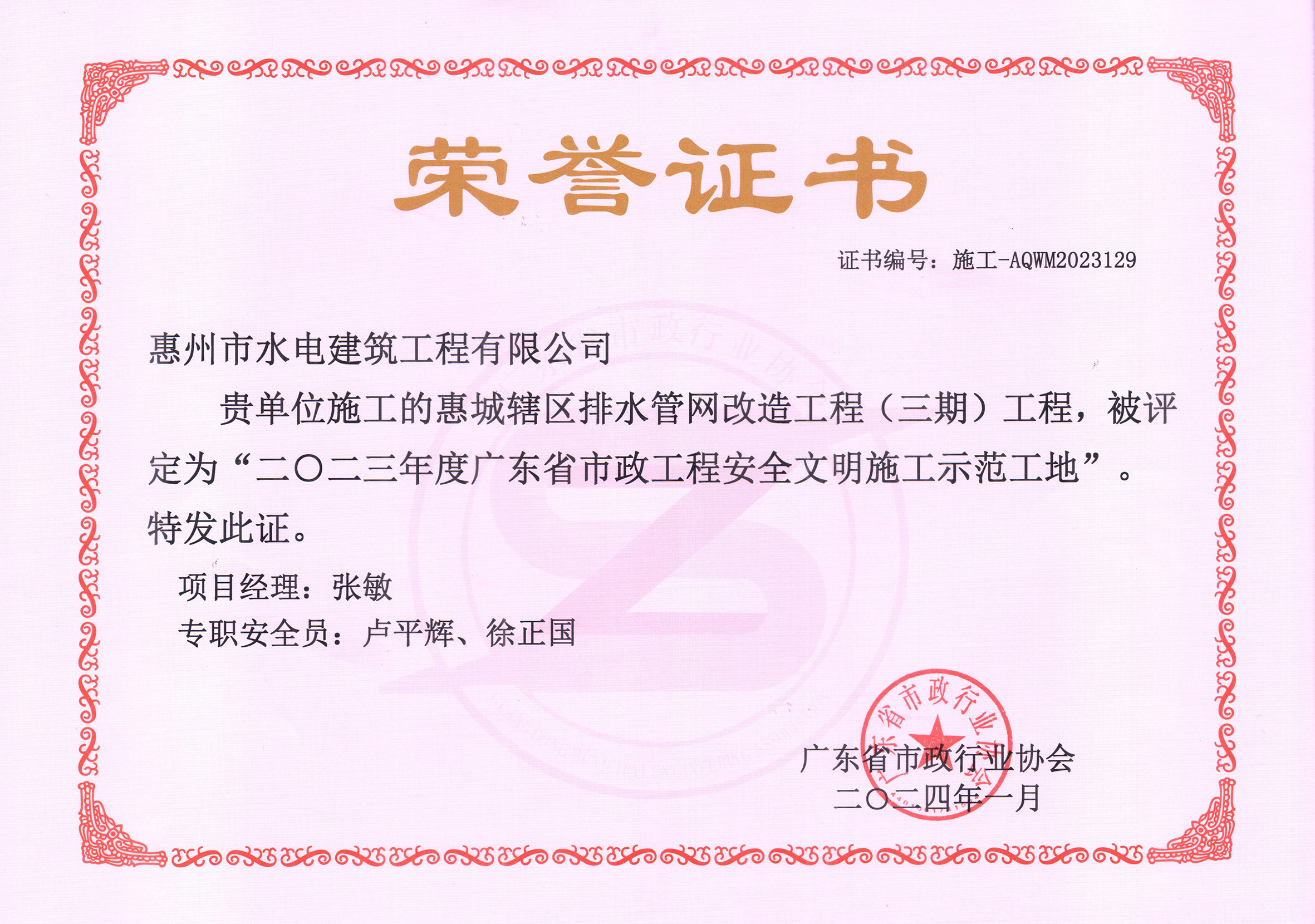 此次惠城轄區(qū)排水管網(wǎng)改造工程(三期)工程獲評(píng)為“2023年度廣東省市政工程安全文明施工示范工地”,是對(duì)公司安全文明施工的再次肯定,也是公司落實(shí)安全文明施工制度的成果體現(xiàn),為公司創(chuàng)優(yōu)成果添加濃重的一筆。