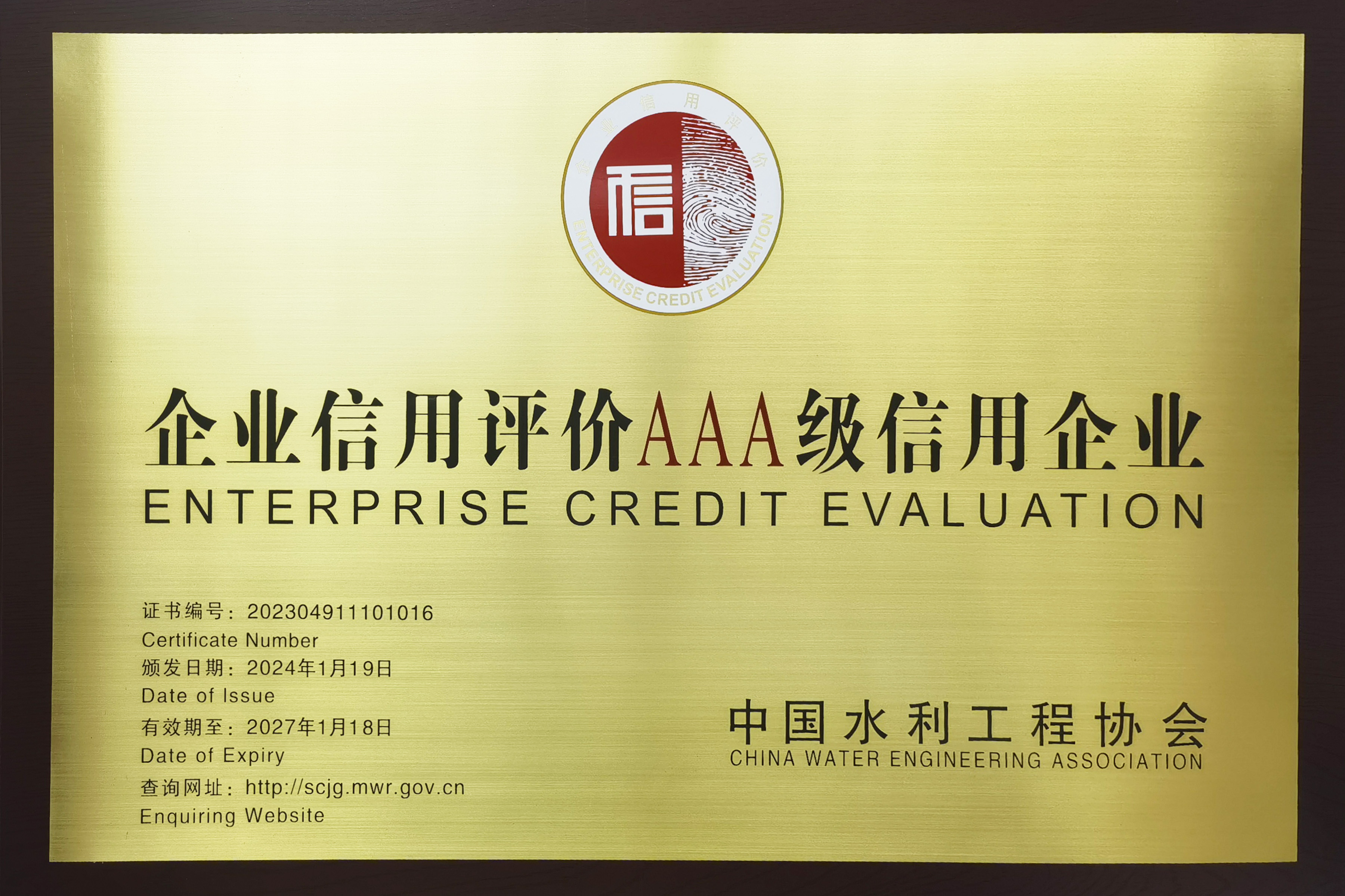 近日,中國(guó)水利工程協(xié)會(huì)向我司頒發(fā)企業(yè)信用評(píng)價(jià)施工類AAA級(jí)信用企業(yè)證書和牌匾。公司自2012年首次參加水利建設(shè)市場(chǎng)主體信用評(píng)價(jià)以來,已經(jīng)連續(xù)12年保持AAA級(jí)最高等級(jí)。