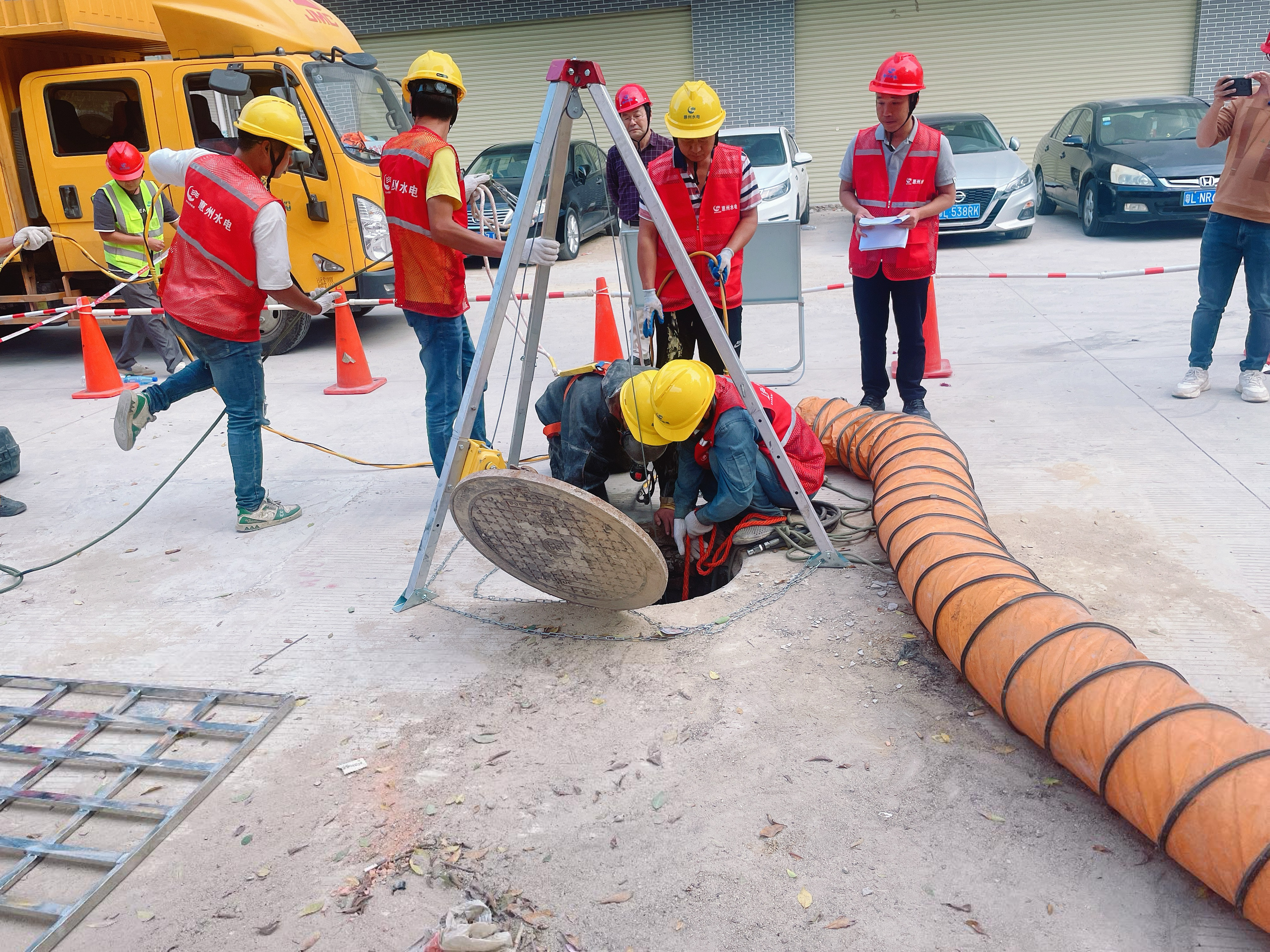 為進一步加強有限空間作業(yè)安全管理,提高作業(yè)人員的安全意識和應急救援能力, 11月5日下午,公司施工八隊在惠城區(qū)水口、馬安等片區(qū)市政排水管網(wǎng)改造工程施工現(xiàn)場開展了有限空間作業(yè)應急演練。本次演練主要是模擬作業(yè)人員在檢查井內(nèi)清理固結(jié)物時,因缺氧窒息而發(fā)生的意外事故。