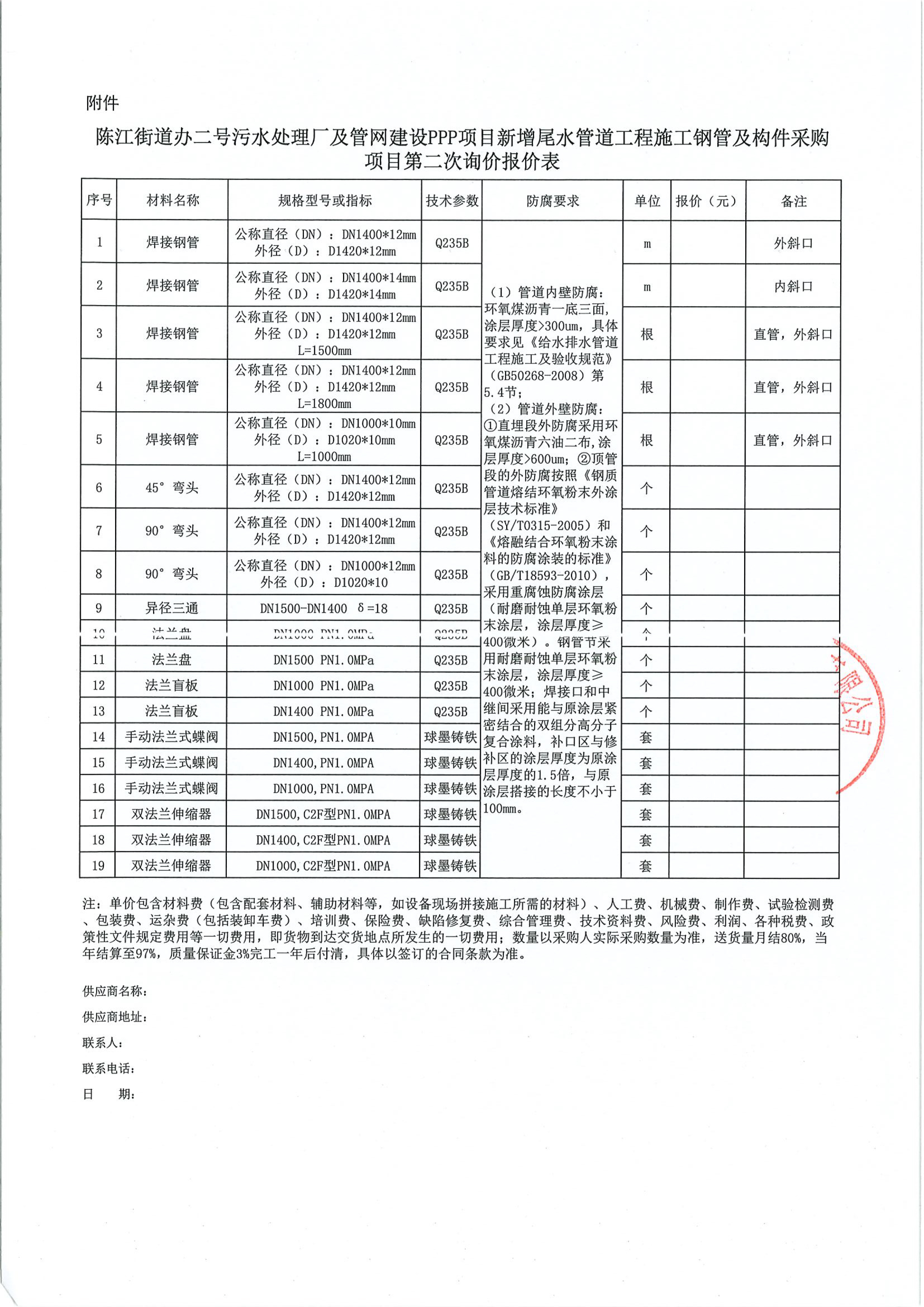 陳江街道辦二號污水處理廠及管網(wǎng)建設(shè)PPP項(xiàng)目新增尾水管道工程鋼管及構(gòu)件采購項(xiàng)目第二次詢價公告附件: