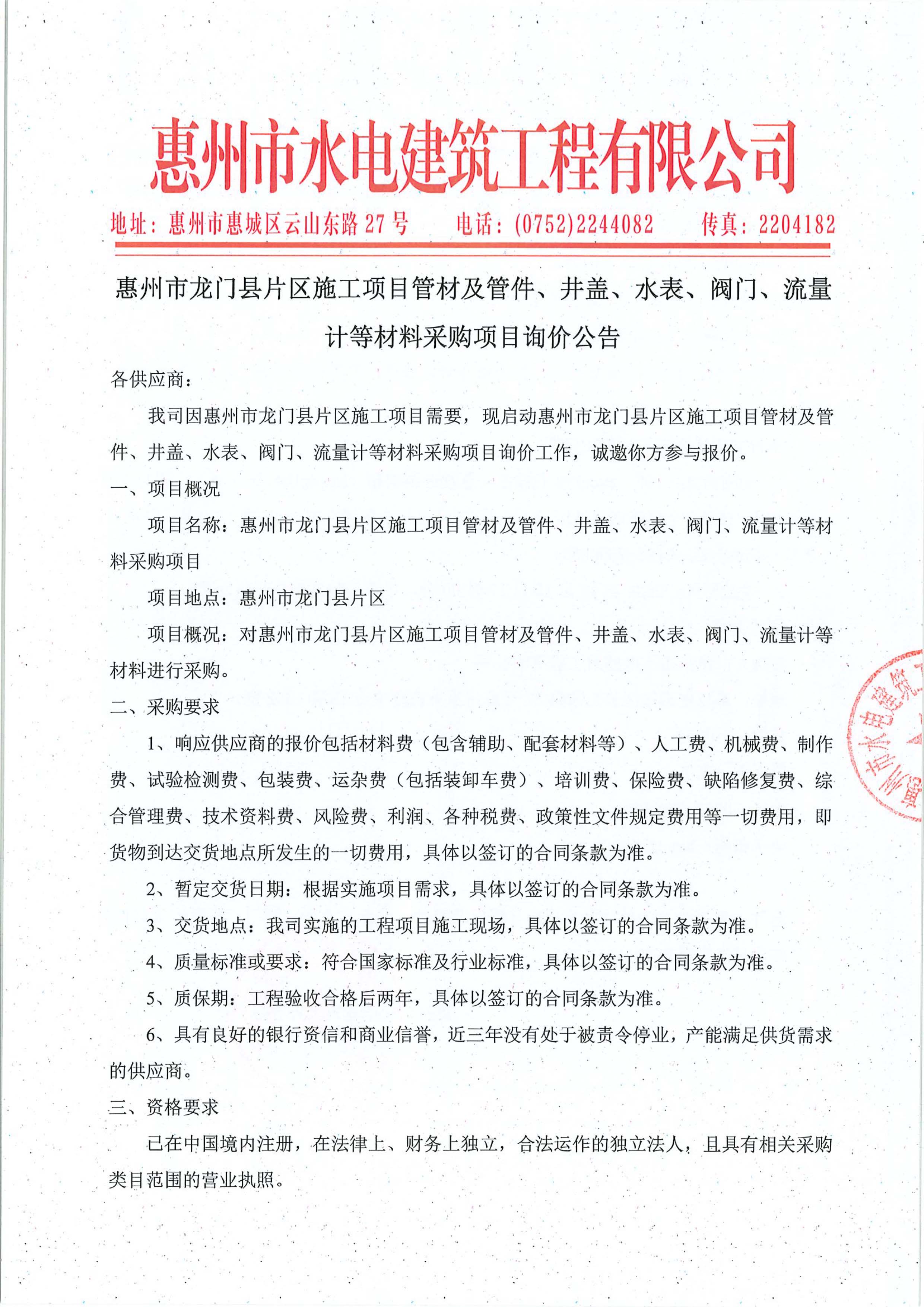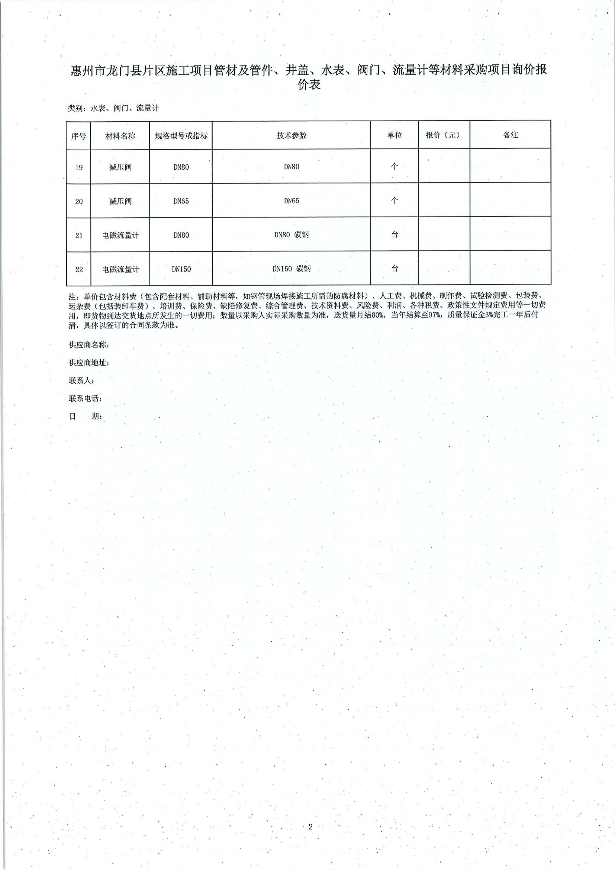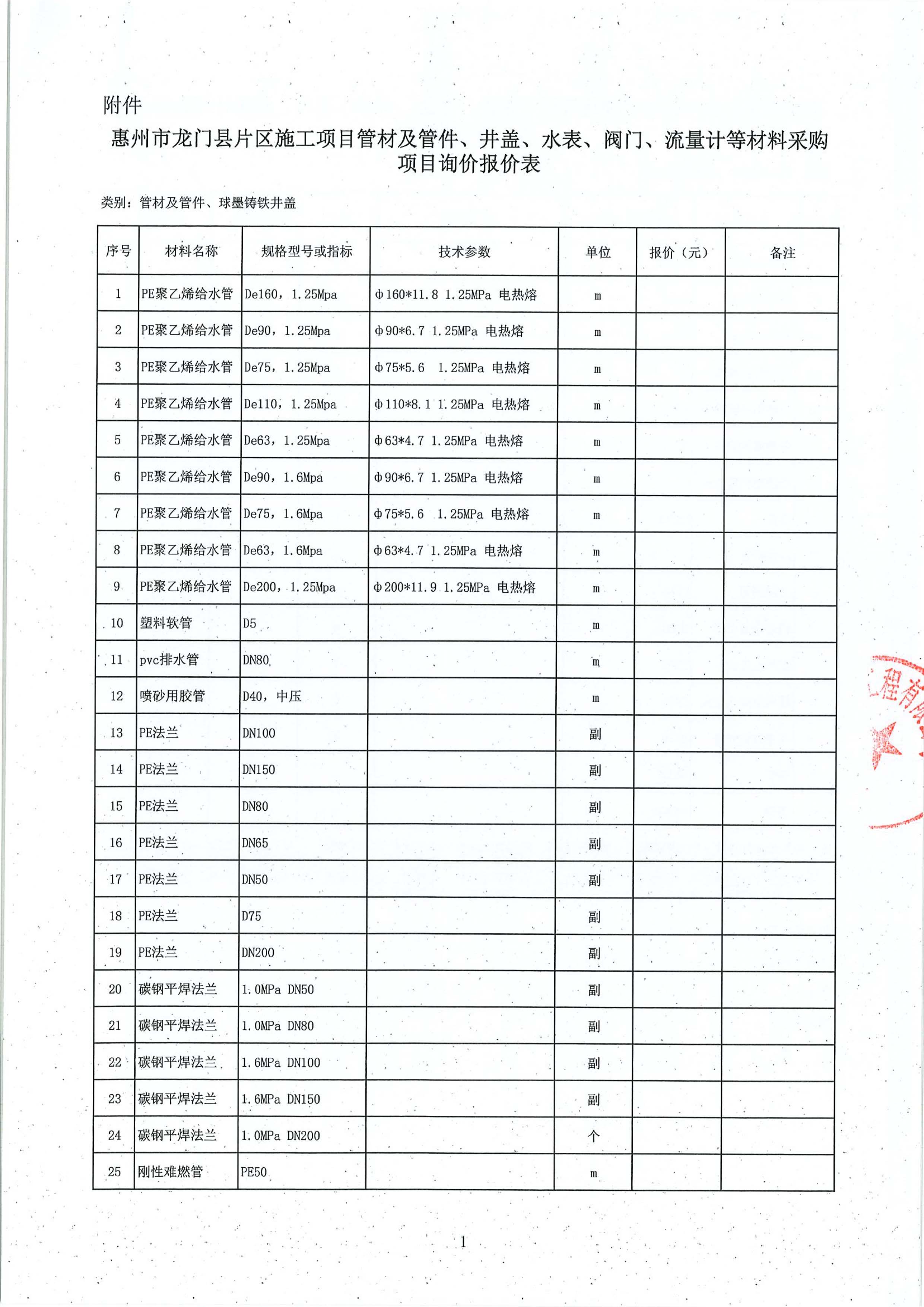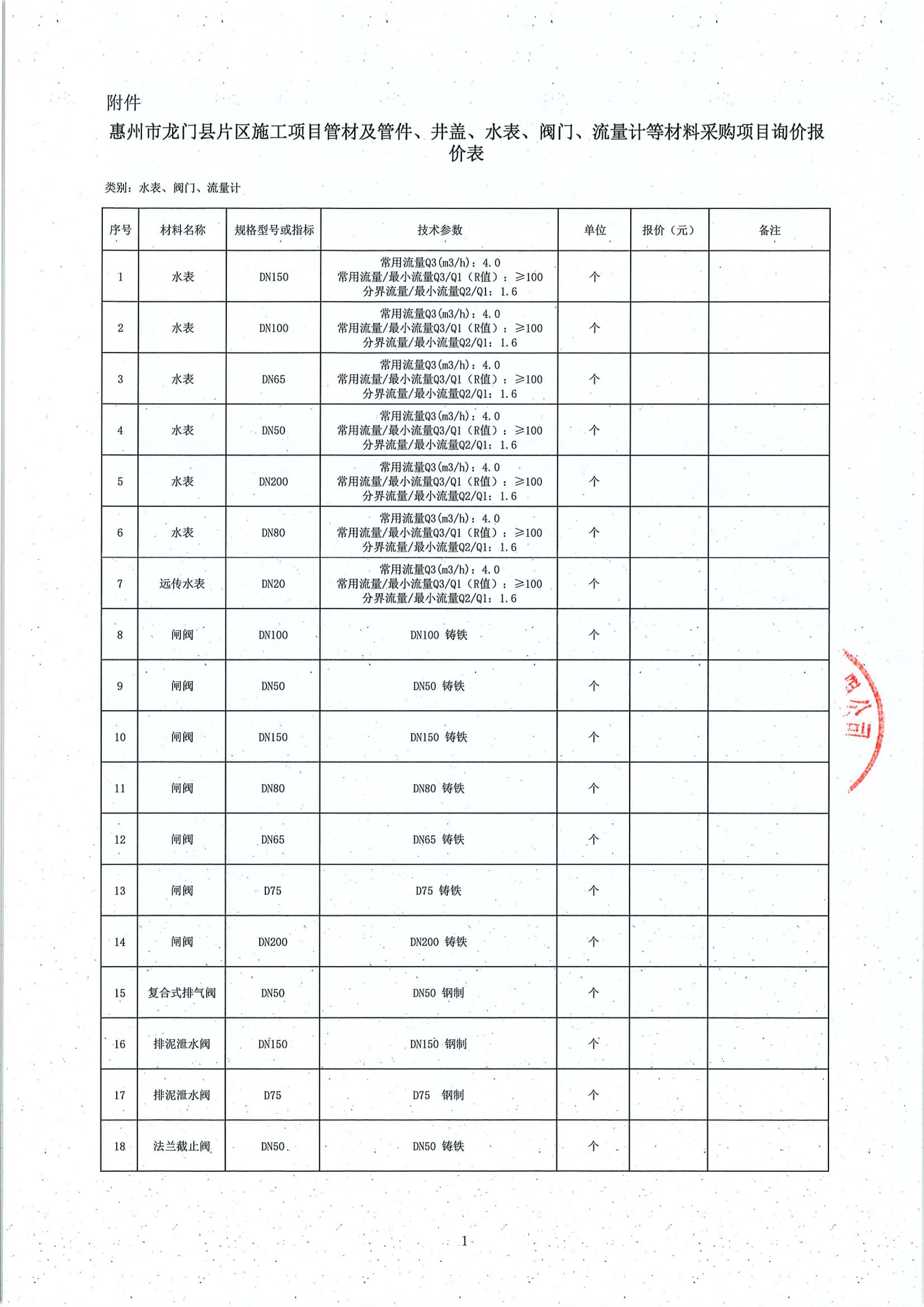 惠州市龍門縣片區(qū)施工項目管材及管件、井蓋、水表、閥門、流量計等材料采購項目詢價公告附件: