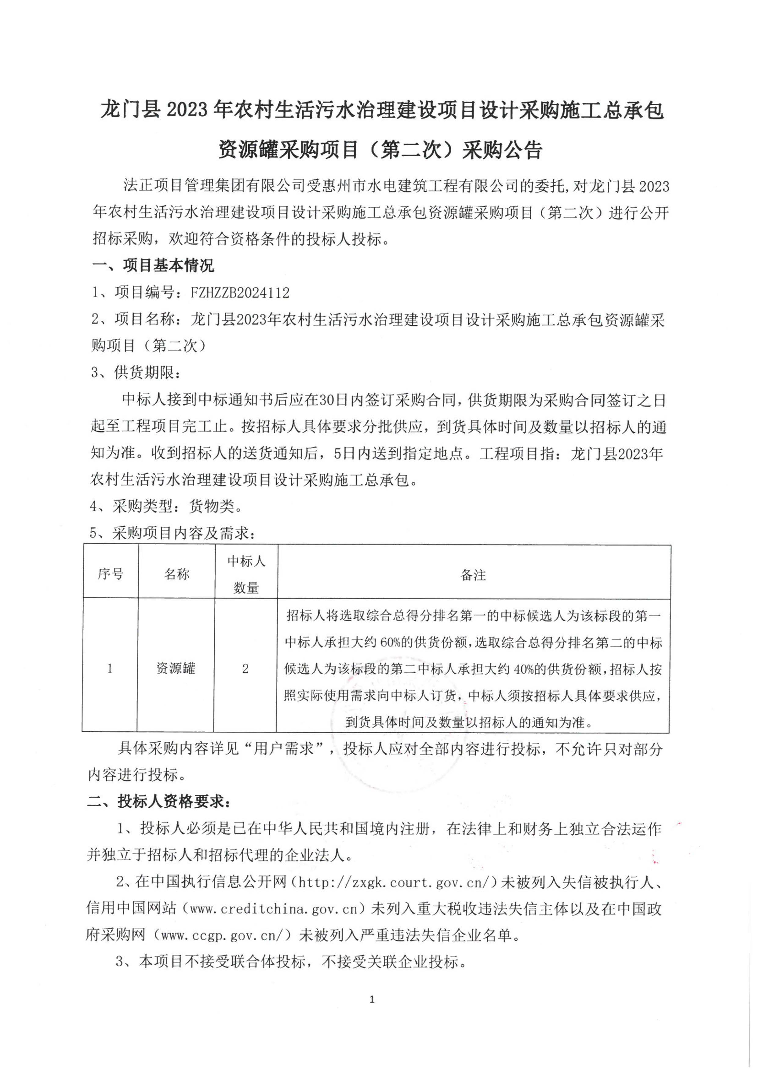 龍門縣2023年農(nóng)村生活污水治理建設(shè)項目設(shè)計采購施工總承包資源罐采購項目(第二次)采購公告