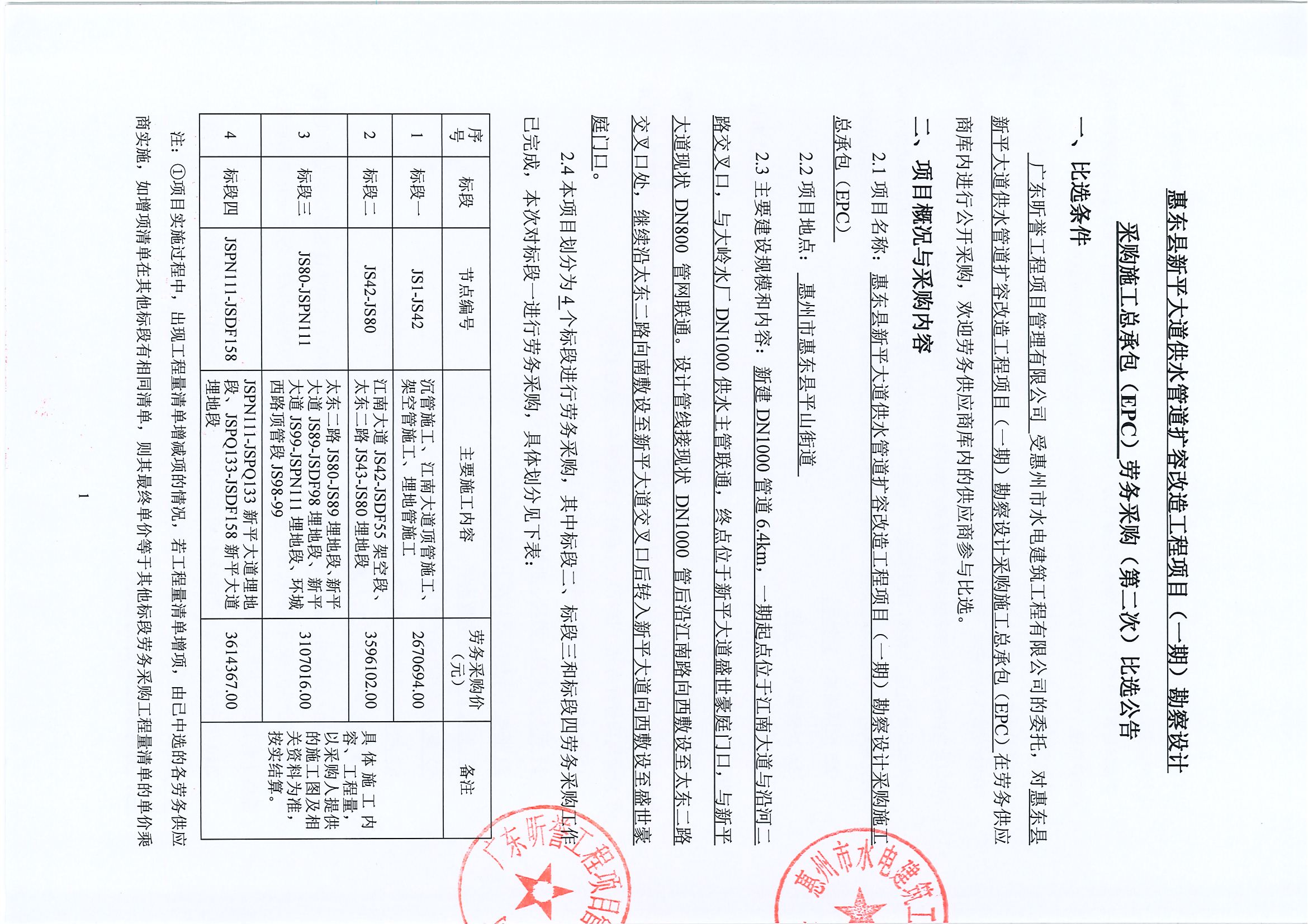 惠東縣新平大道供水管道擴容改造工程項目(一期)勘察設(shè)計采購施工總承包(EPC)勞務(wù)采購中選候選人公示