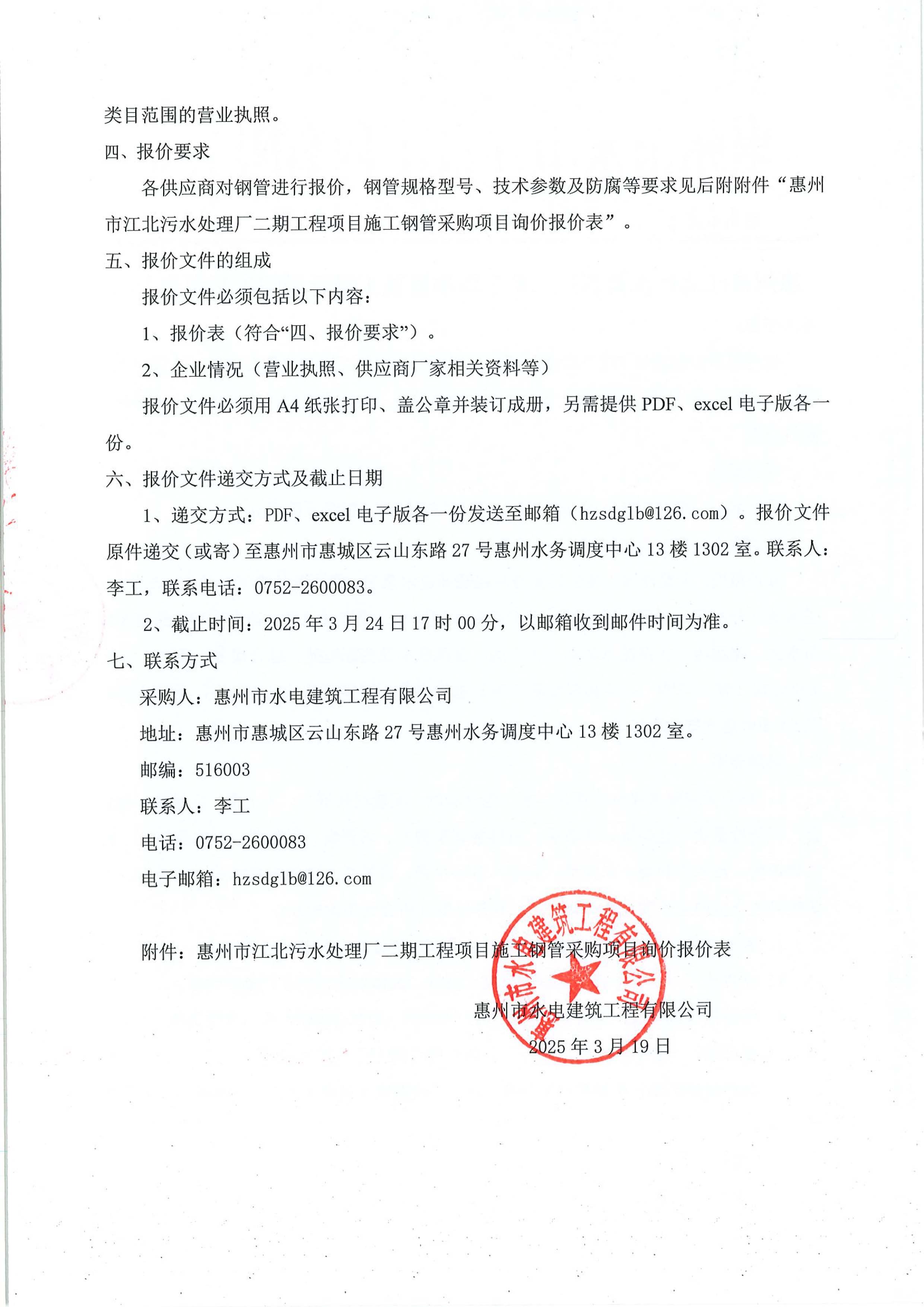 惠州市江北污水處理廠二期工程項目施工鋼管采購項目詢價公告附件: