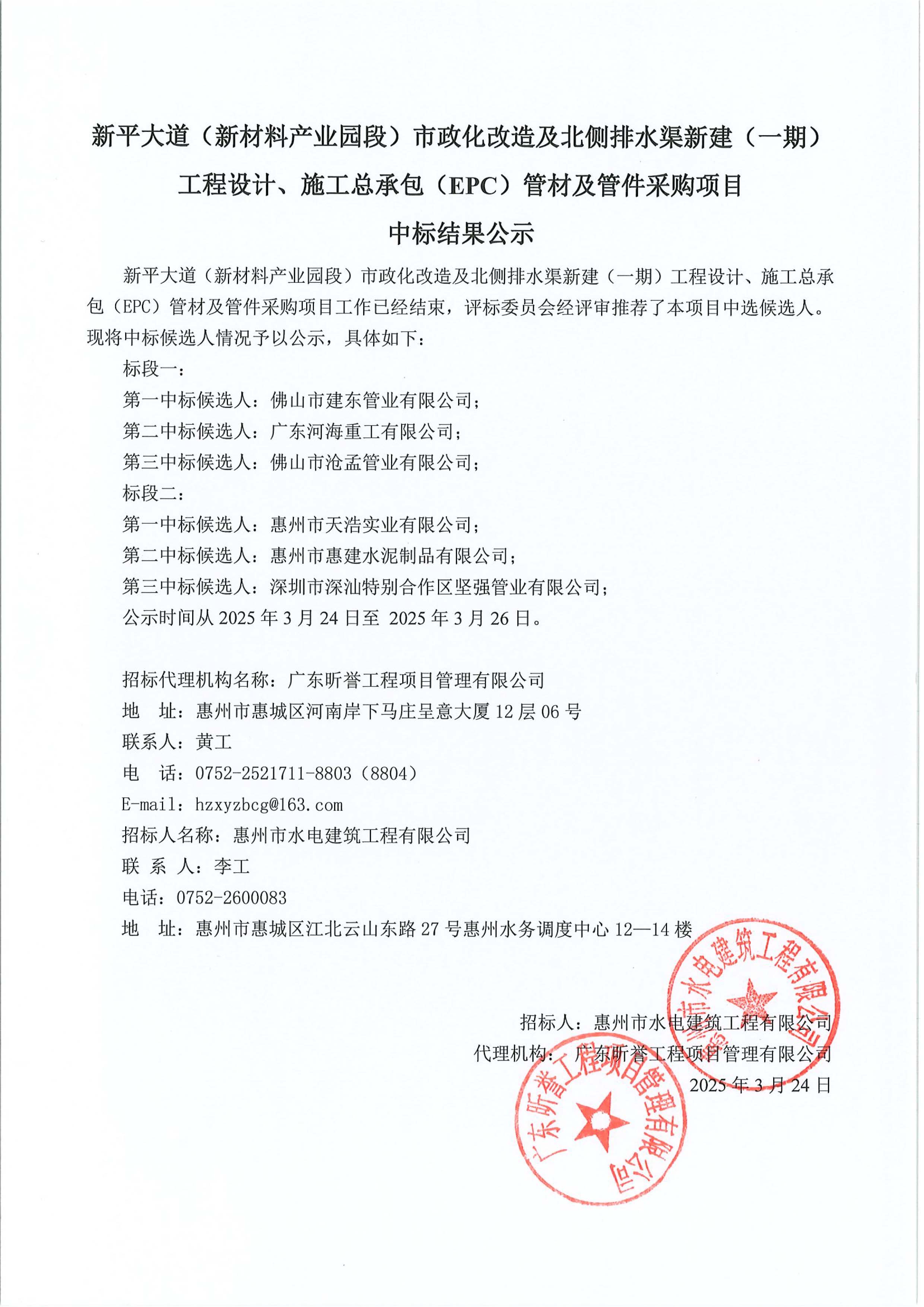 新平大道(新材料產(chǎn)業(yè)園段)市政化改造及北側(cè)排水渠新建(一期)工程設(shè)計、施工總承包(EPC)管材及管件采購項目中標(biāo)結(jié)果公示