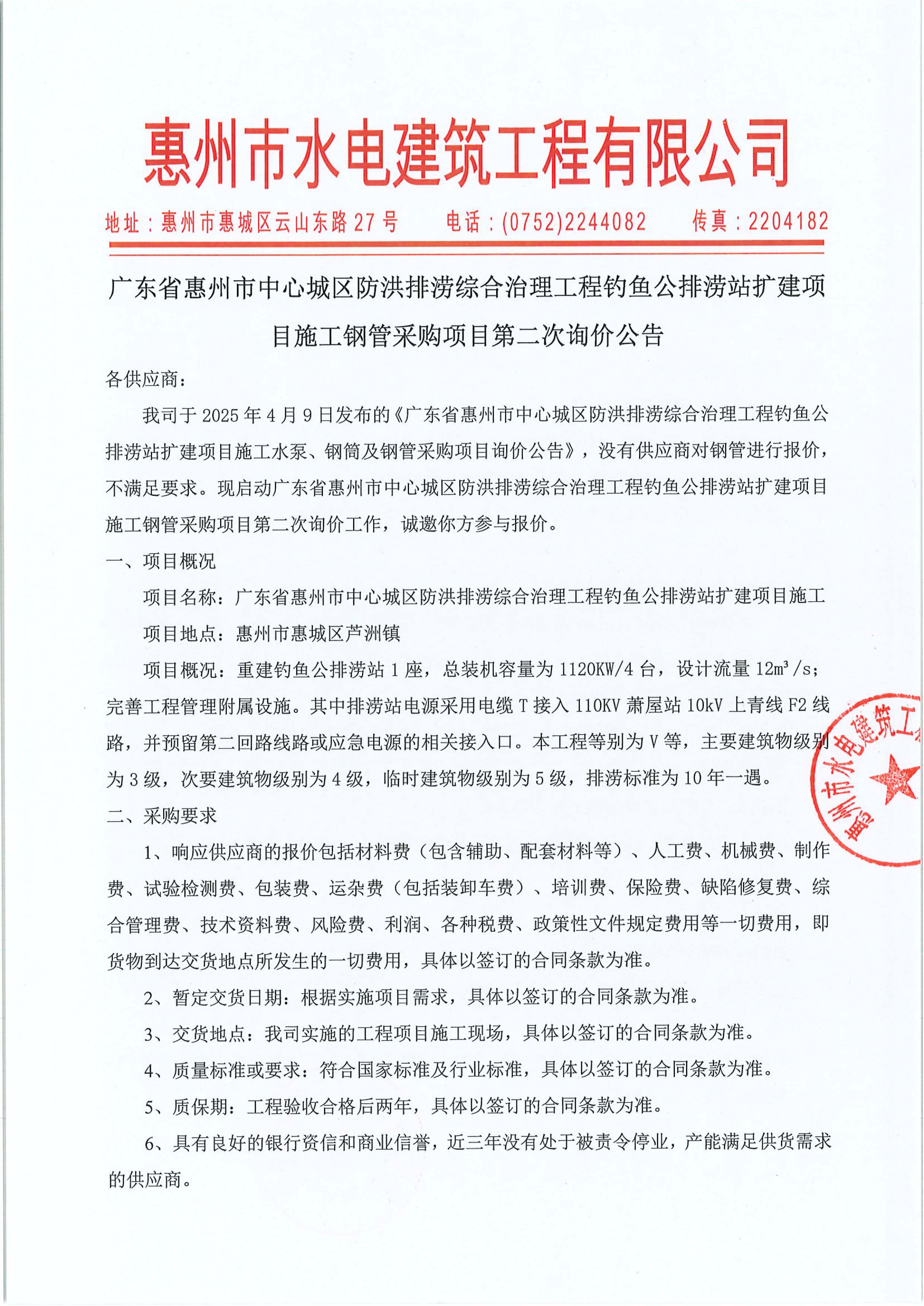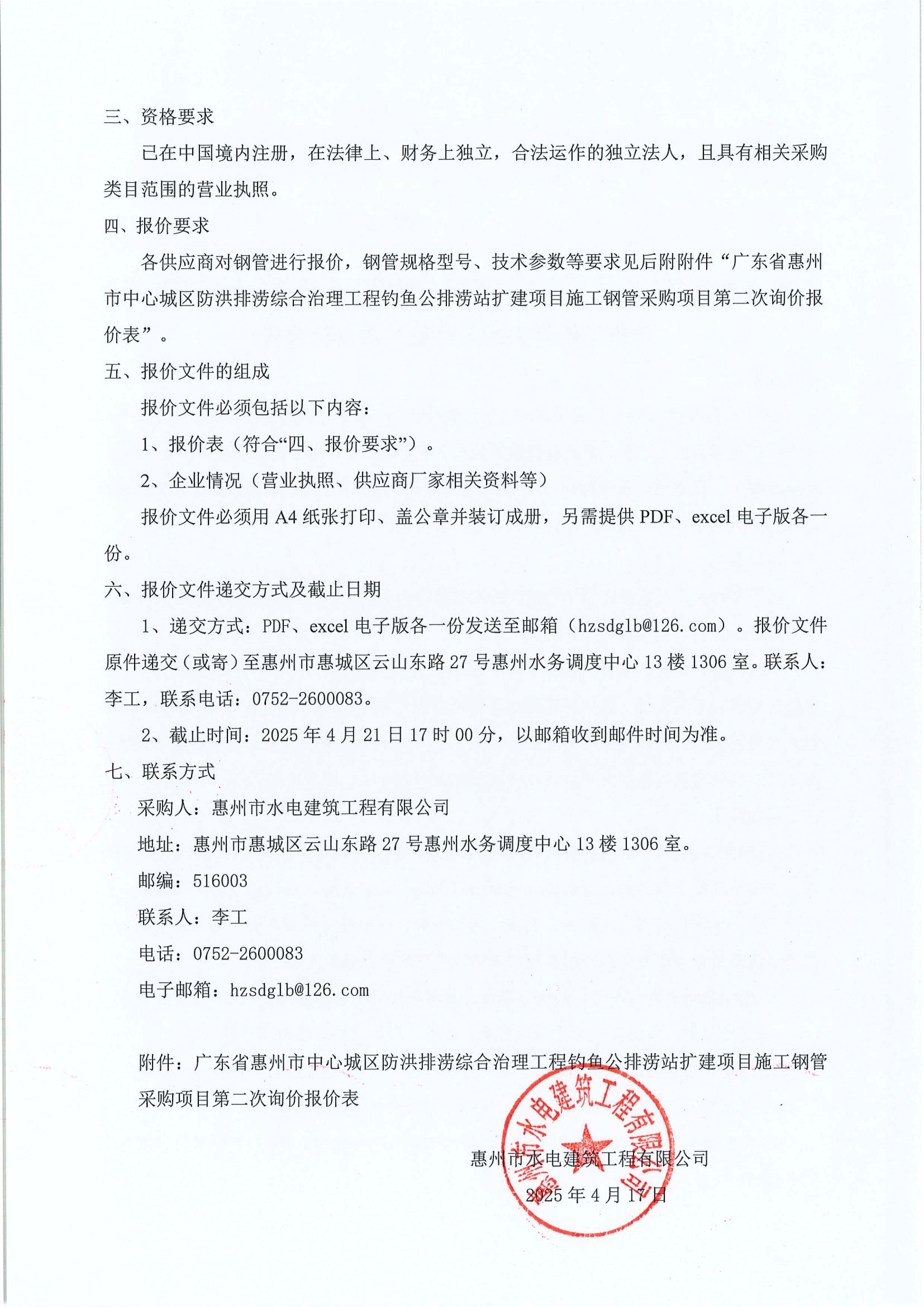 廣東省惠州市中心城區(qū)防洪排澇綜合治理工程釣魚(yú)公排澇站擴(kuò)建項(xiàng)目施工鋼管采購(gòu)項(xiàng)目第二次詢價(jià)公告附件: