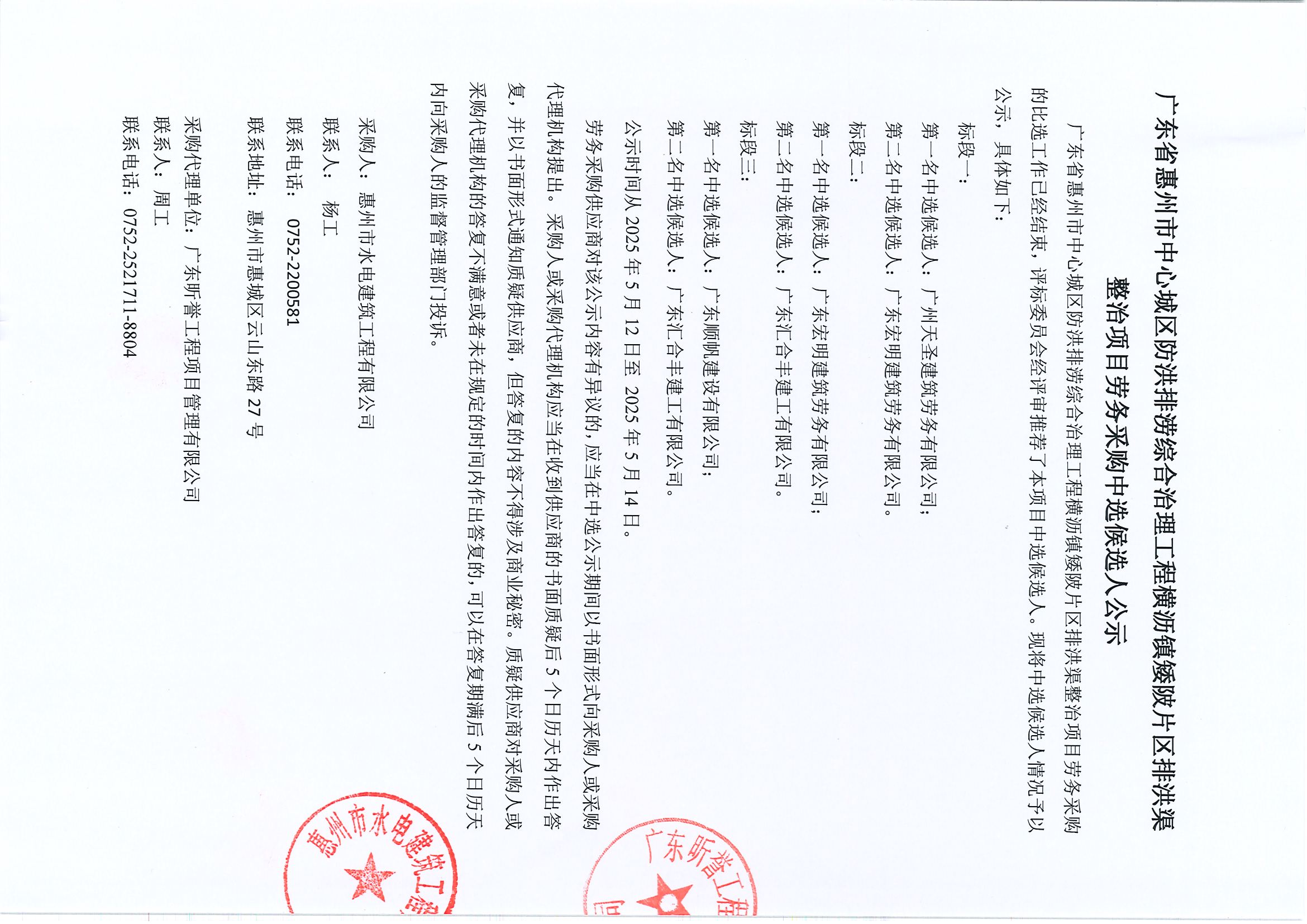 廣東省惠州市中心城區(qū)防洪排澇綜合治理工程橫瀝鎮(zhèn)矮陂片區(qū)排洪渠整治項(xiàng)目勞務(wù)采購(gòu)中選候選人公示