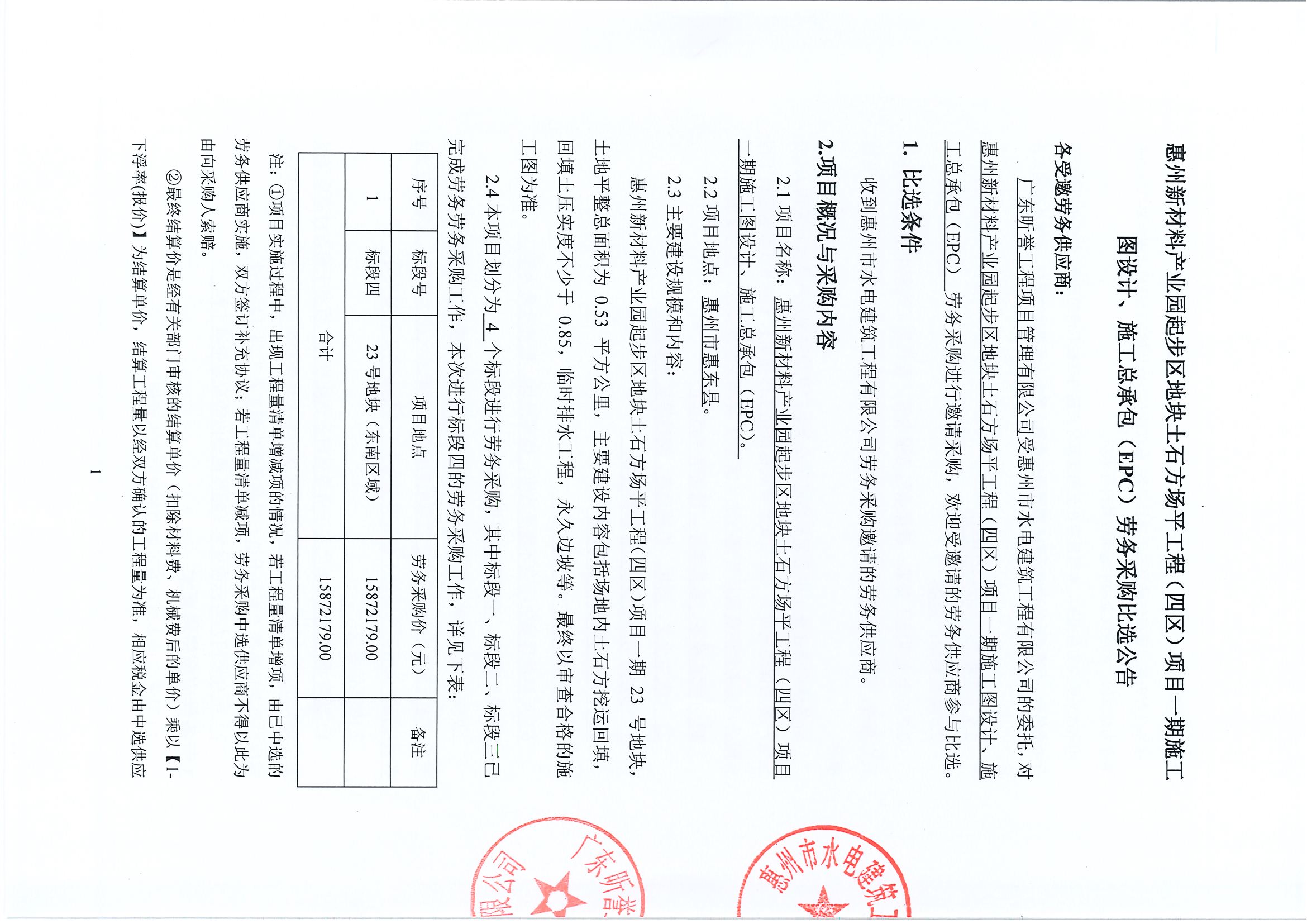惠州新材料產(chǎn)業(yè)園起步區(qū)地塊土石方場平工程(四區(qū))項目一期施工圖設(shè)計、施工總承包(EPC)勞務(wù)采購比選公告