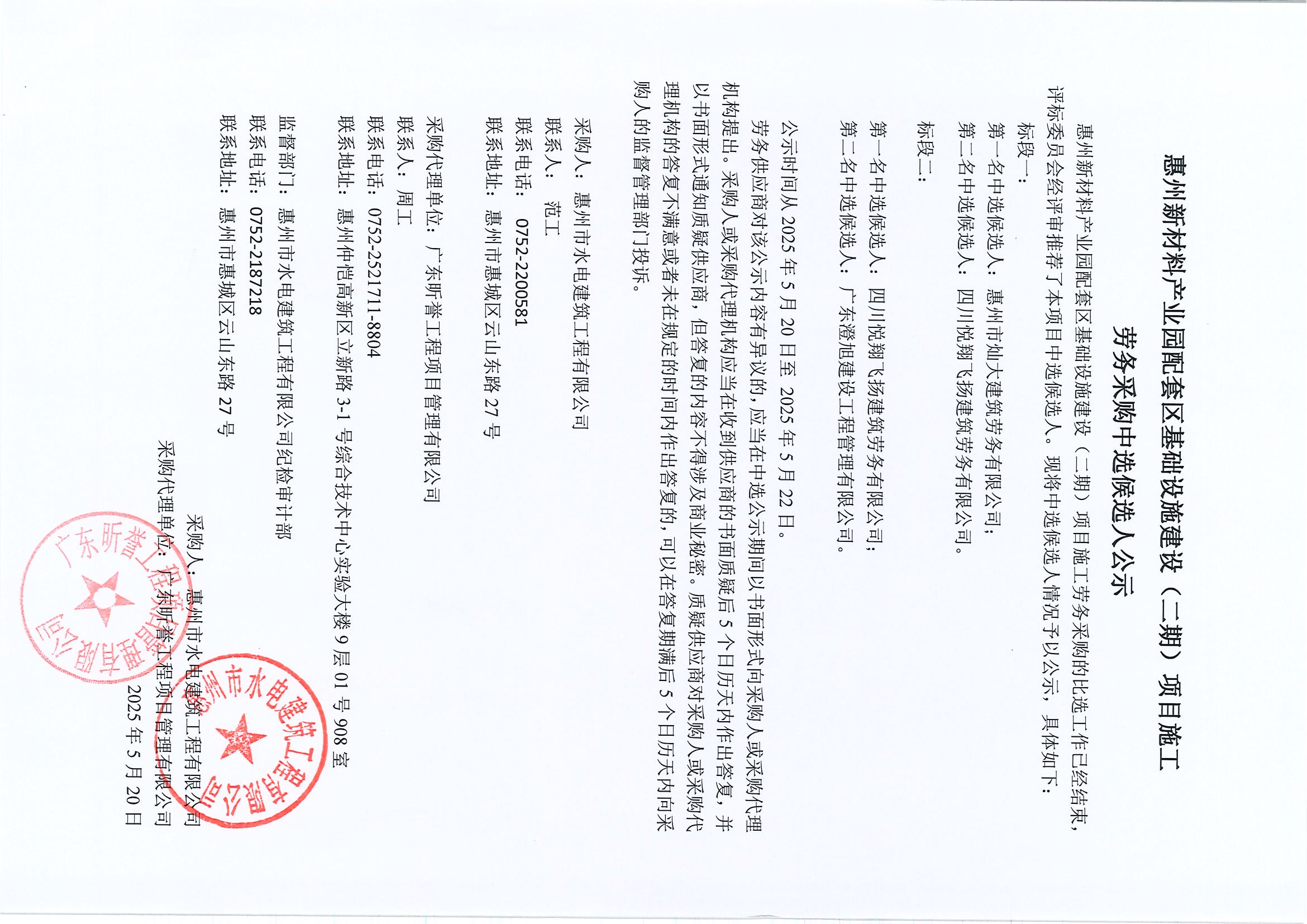 惠州新材料產(chǎn)業(yè)園配套區(qū)基礎(chǔ)設(shè)施建設(shè)(二期)項(xiàng)目施工勞務(wù)采購(gòu)中選候選人公示