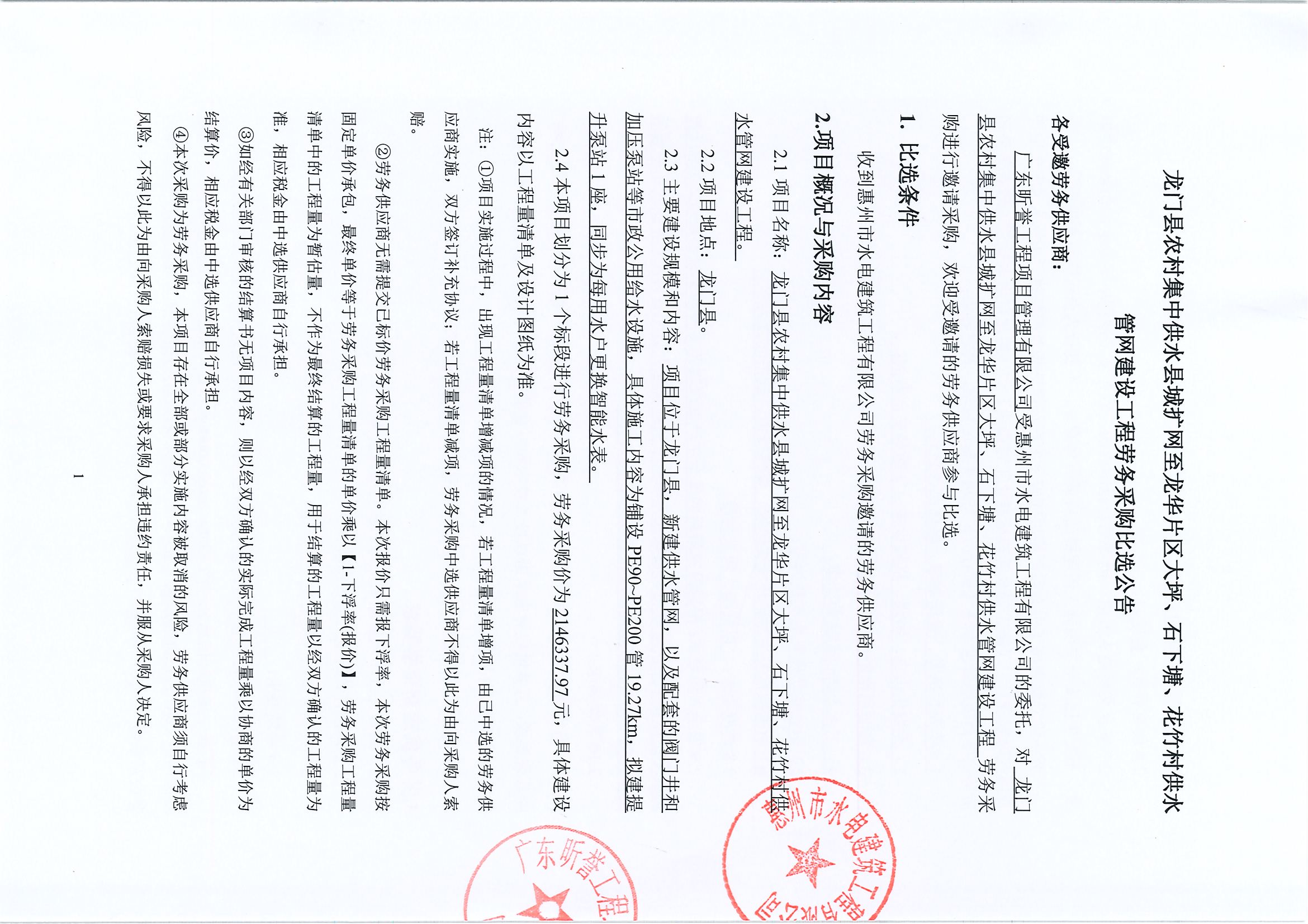 龍門縣農(nóng)村集中供水縣城擴網(wǎng)至龍華片區(qū)大坪、石下塘、花竹村供水管網(wǎng)建設工程勞務采購比選公告
