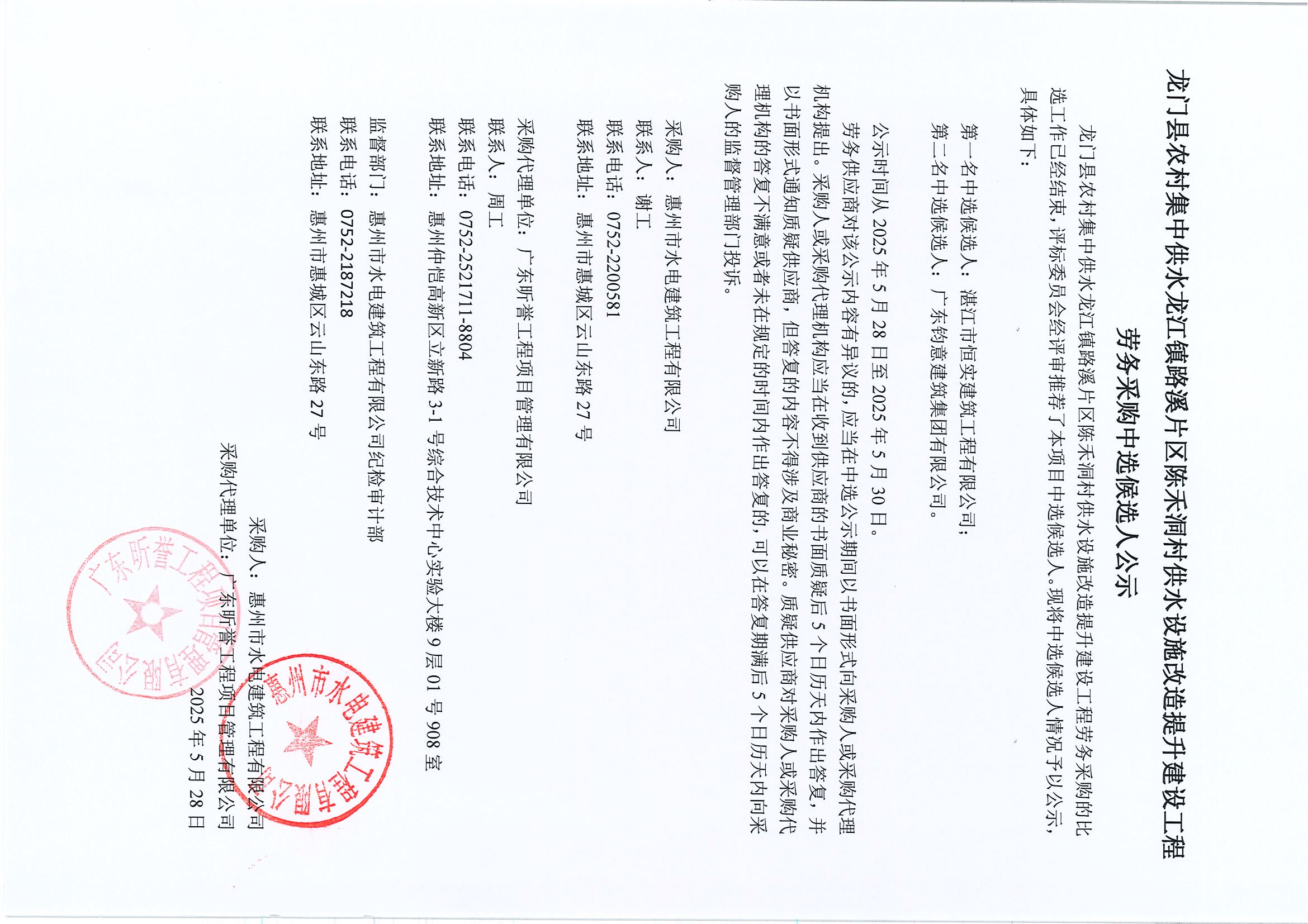 龍門縣農(nóng)村集中供水龍江石下、甘坑村,平陵片區(qū)供水設(shè)施改造提升建設(shè)工程勞務(wù)采購中選候選人公示