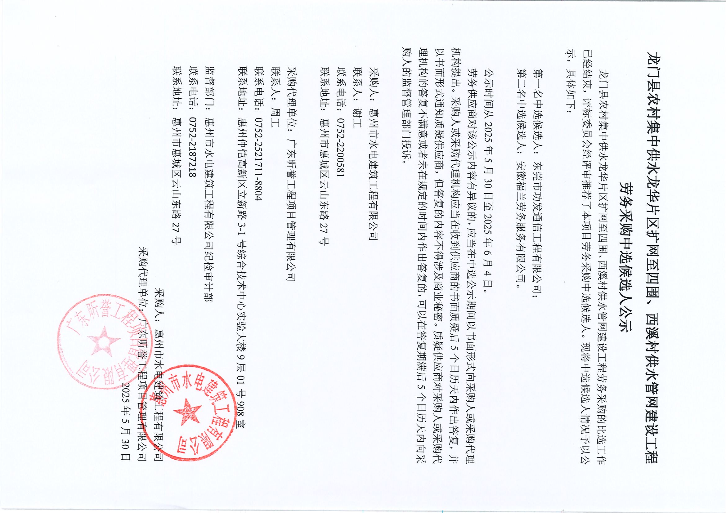 龍門縣農(nóng)村集中供水龍華片區(qū)擴(kuò)網(wǎng)至四圍、西溪村供水管網(wǎng)建設(shè)工程勞務(wù)采購(gòu)中選候選人公示