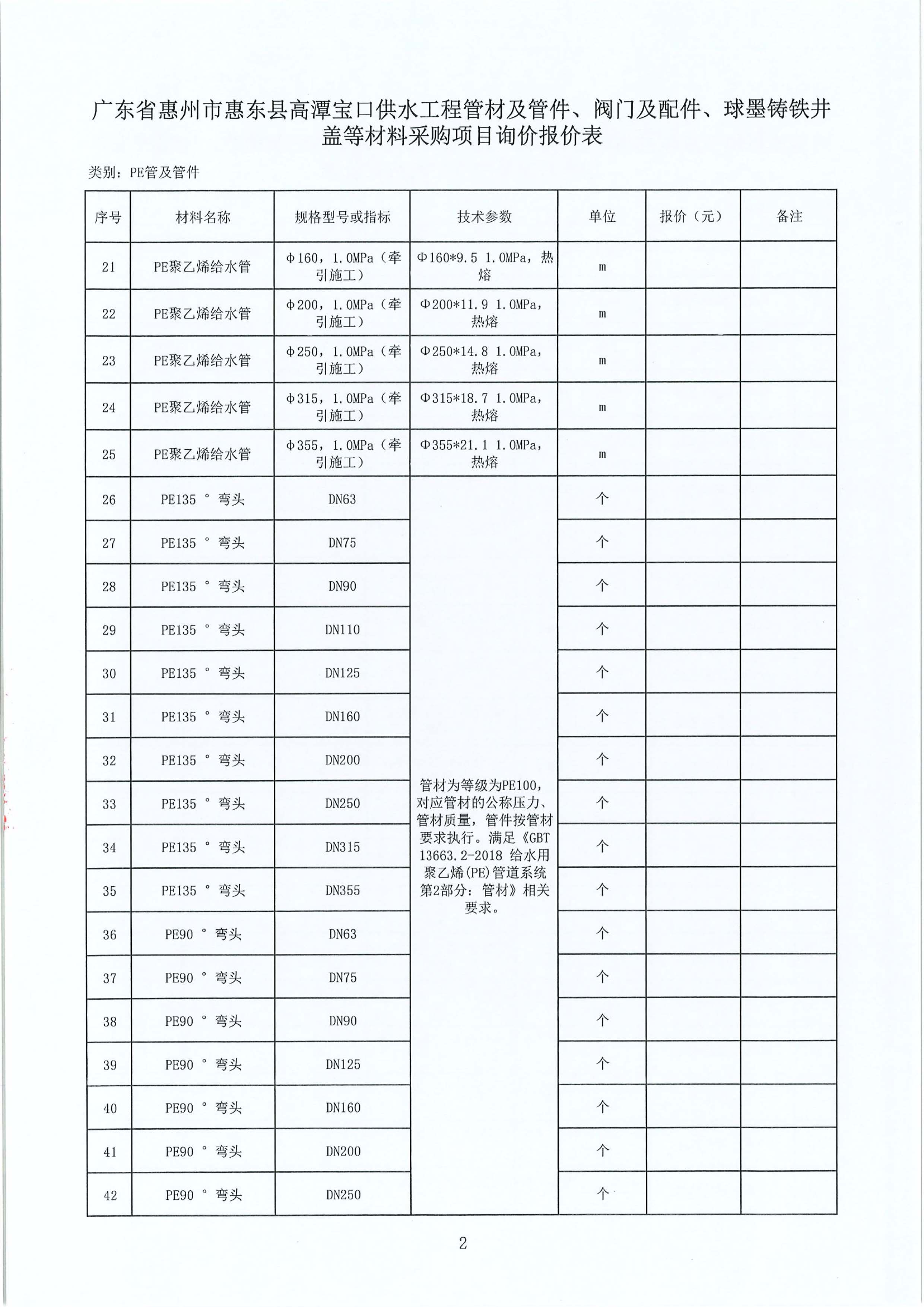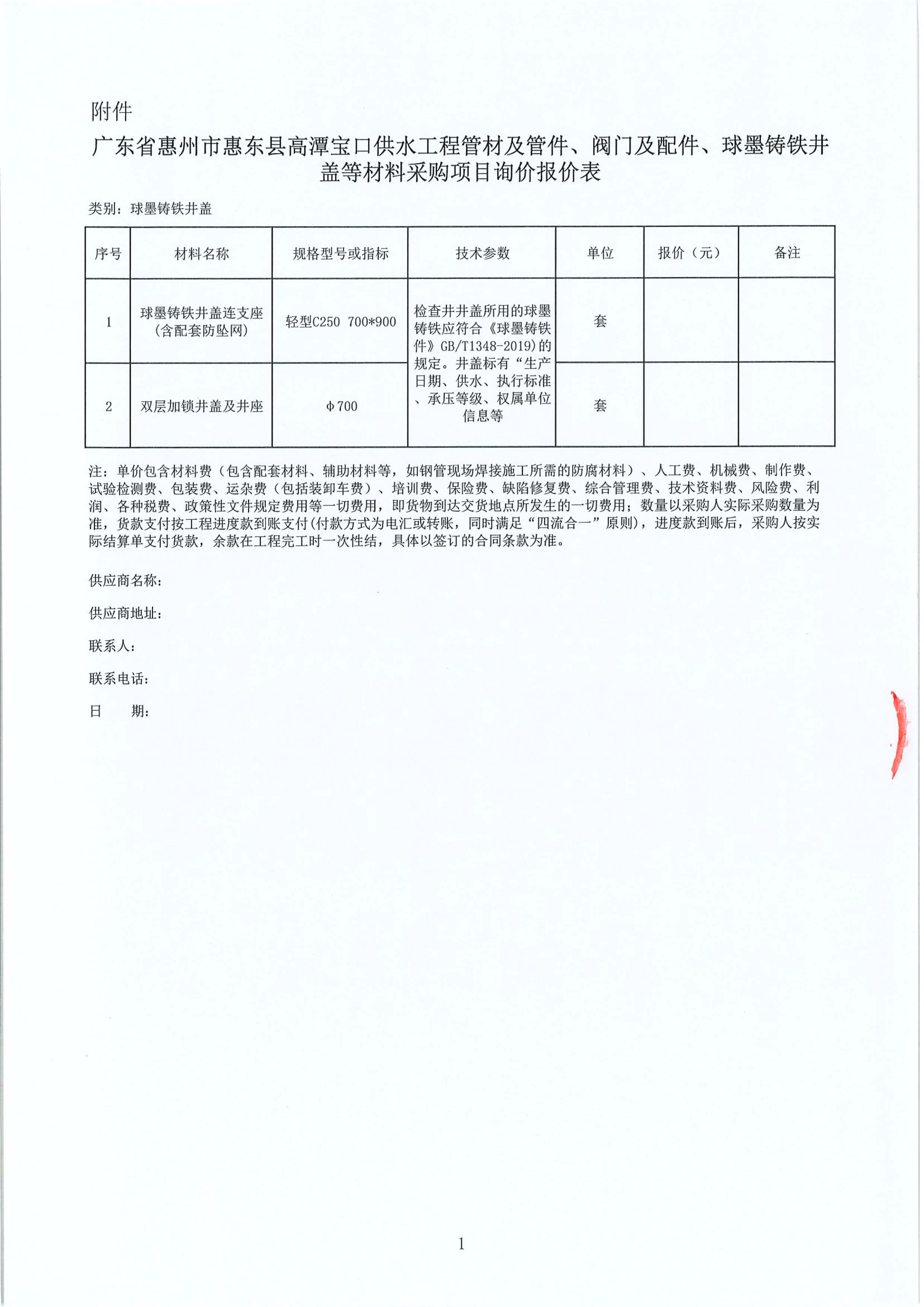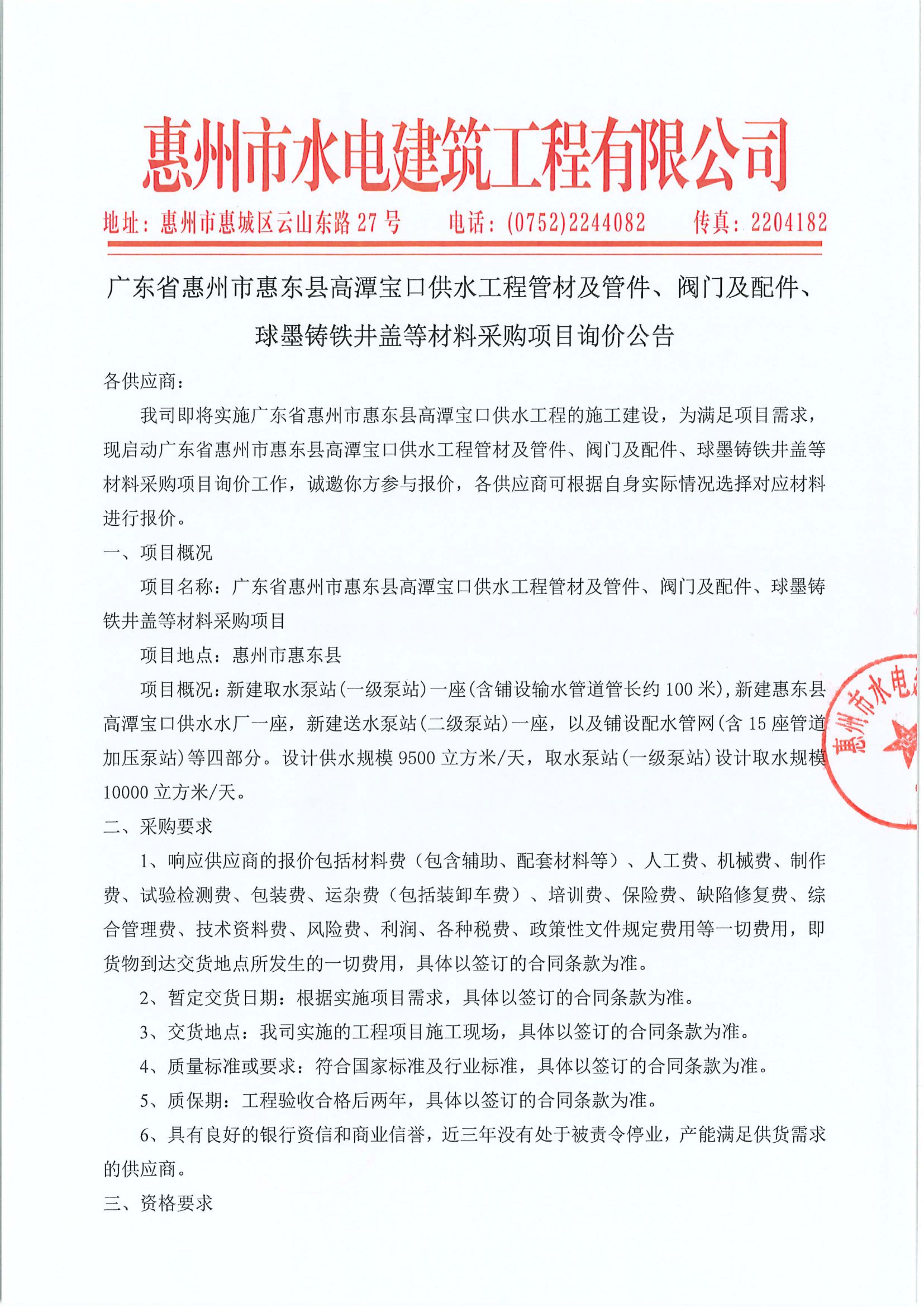 廣東省惠州市惠東縣高潭寶口供水工程施工管材及管件、閥門及配件、球墨鑄鐵井蓋等材料采購項(xiàng)目詢價(jià)公告