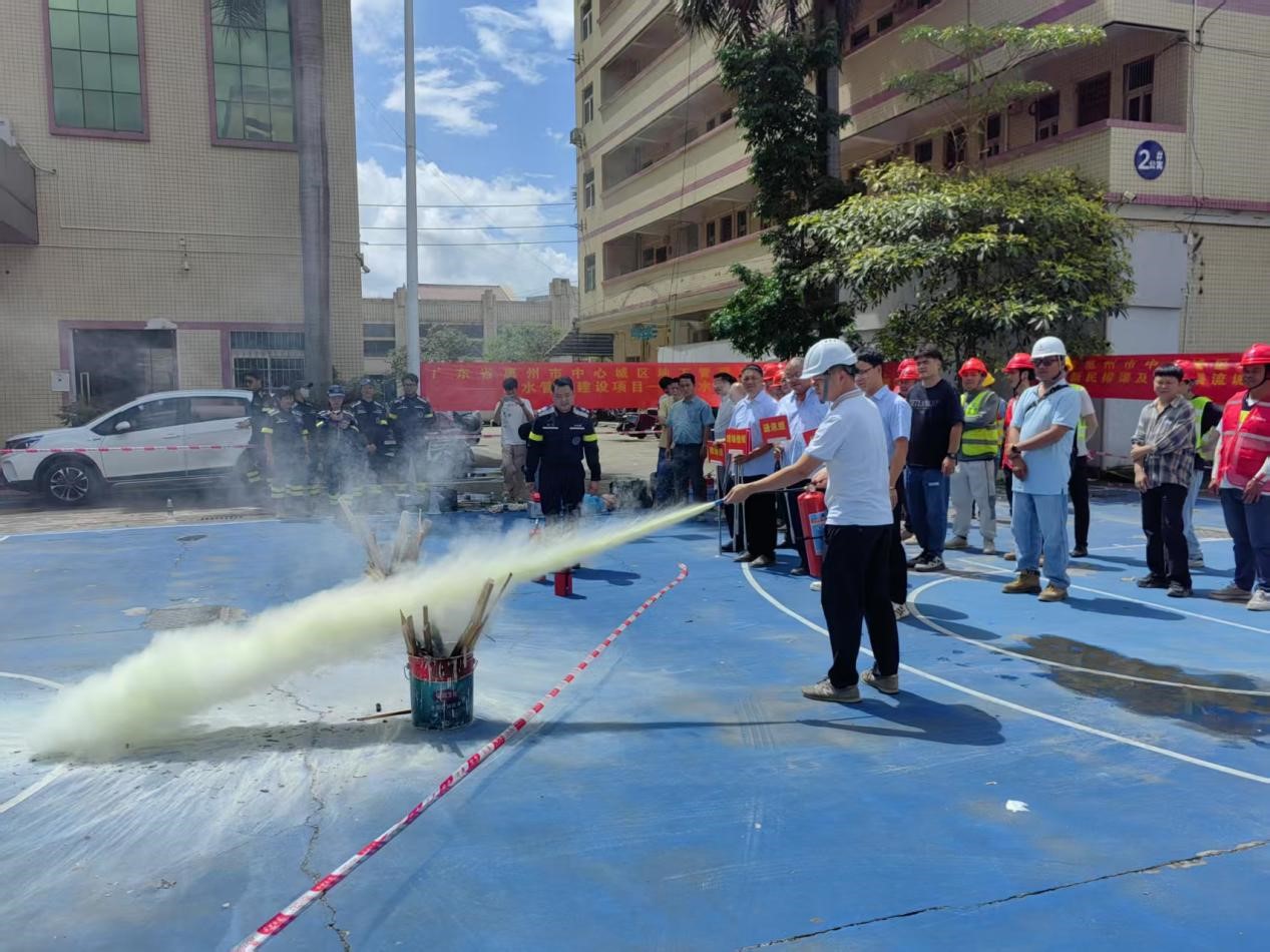 ?滅火器實操演練。參訓人員分組使用干粉滅火器撲滅油盆火,譚教官現(xiàn)場糾正操作誤區(qū),強調(diào)“提、拔、握、壓”四步法,確保每位員工都能正確使用消防器材。