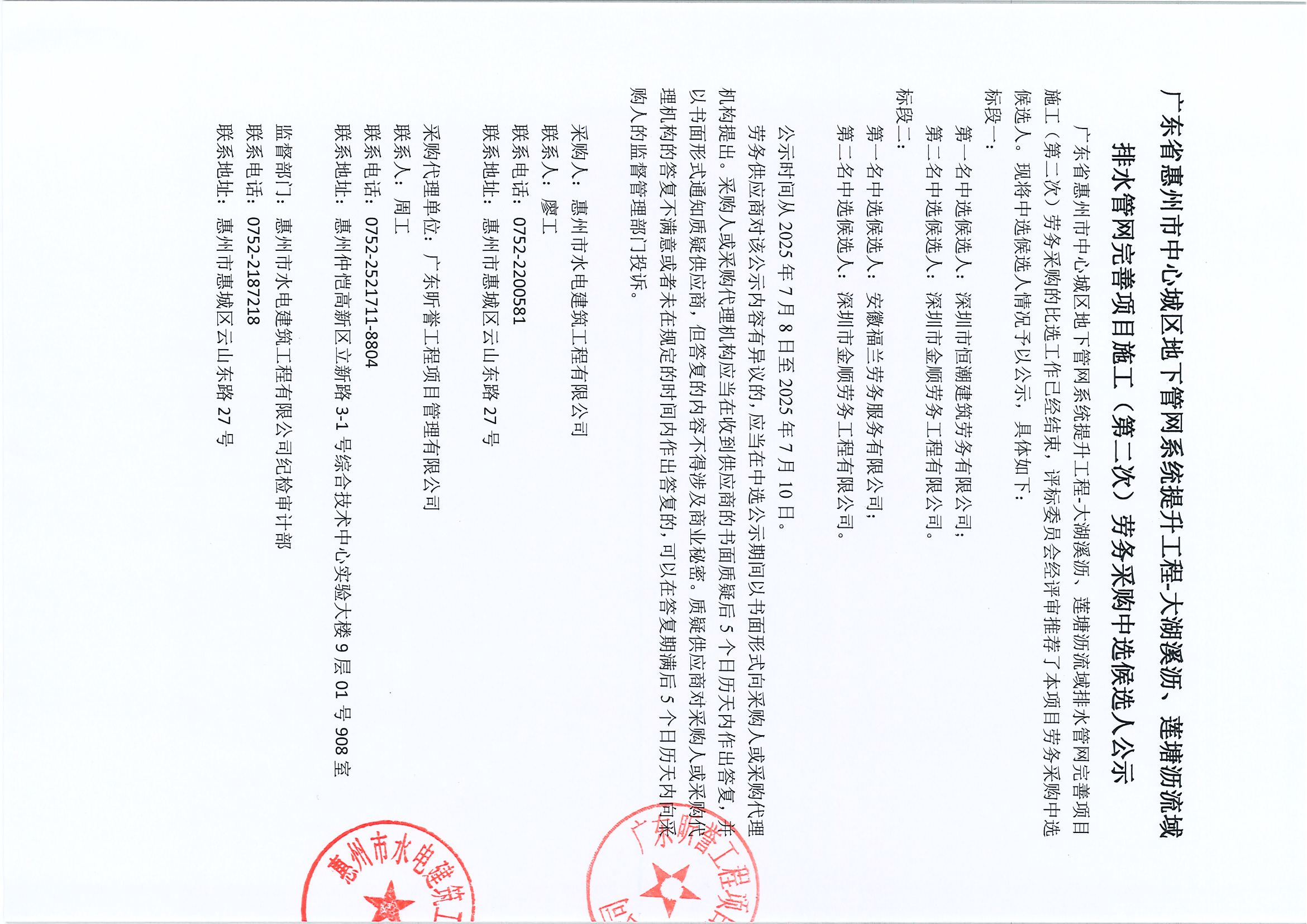 廣東省惠州市中心城區(qū)地下管網(wǎng)系統(tǒng)提升工程-大湖溪瀝、蓮塘瀝流域排水管網(wǎng)完善項目施工(第二次)勞務(wù)采購中選候選人公示