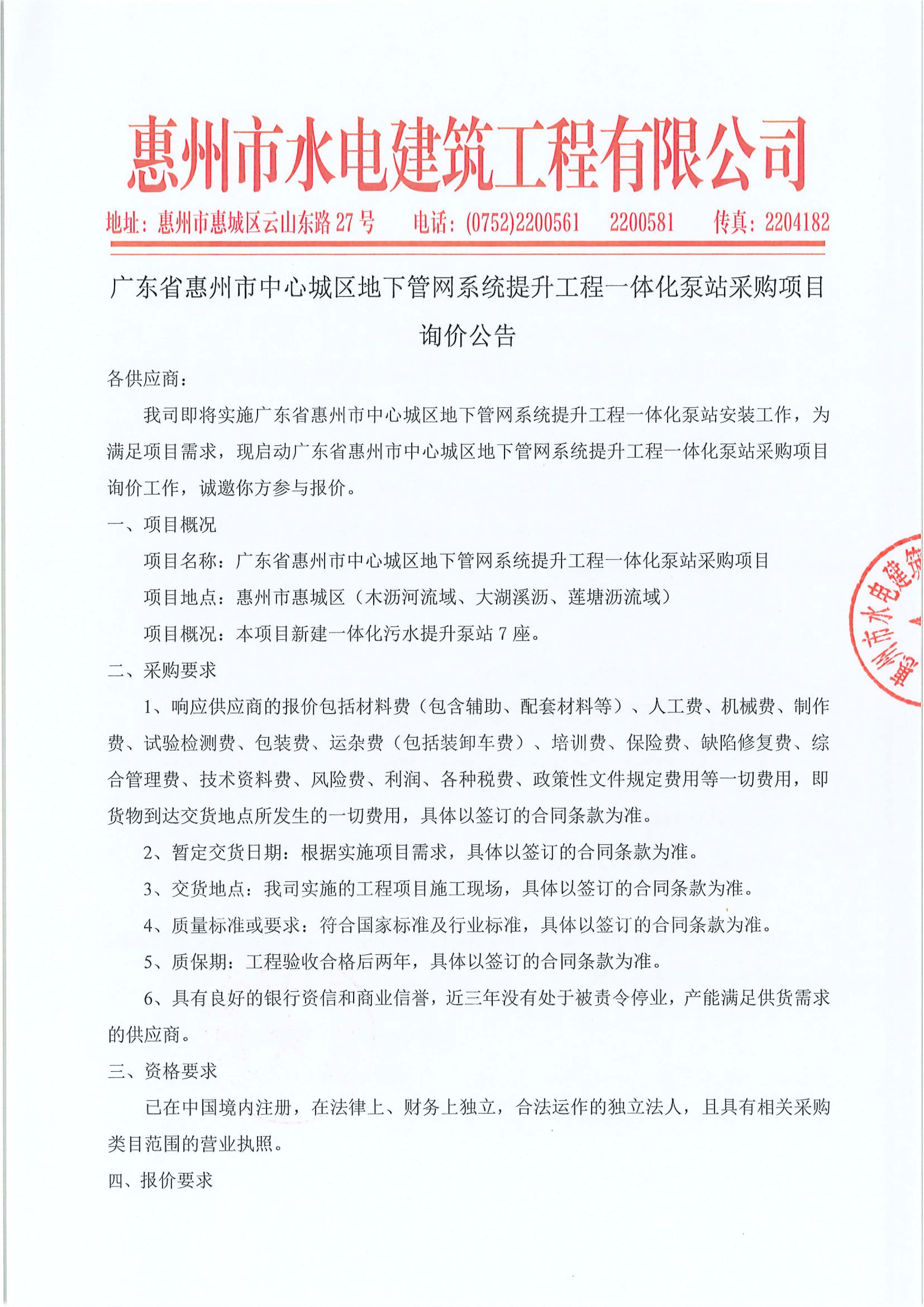 廣東省惠州市中心城區(qū)地下管網(wǎng)系統(tǒng)提升工程一體化泵站采購項目詢價公告