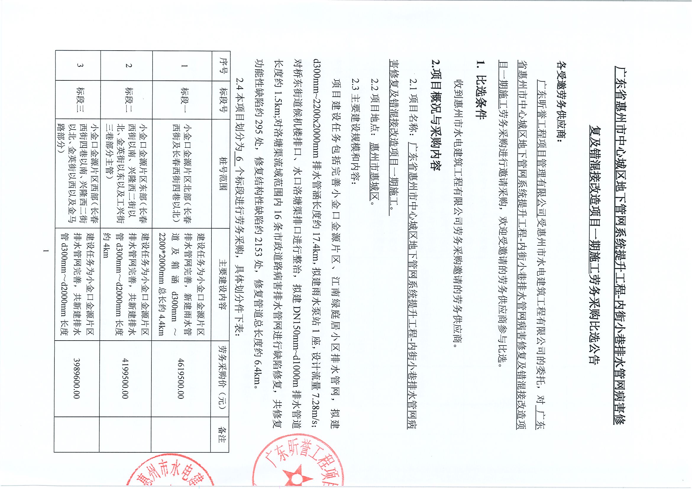 廣東省惠州市中心城區(qū)地下管網(wǎng)系統(tǒng)提升工程-內(nèi)街小巷排水管網(wǎng)病害修復(fù)及錯混接改造項目一期施工勞務(wù)采購比選公告