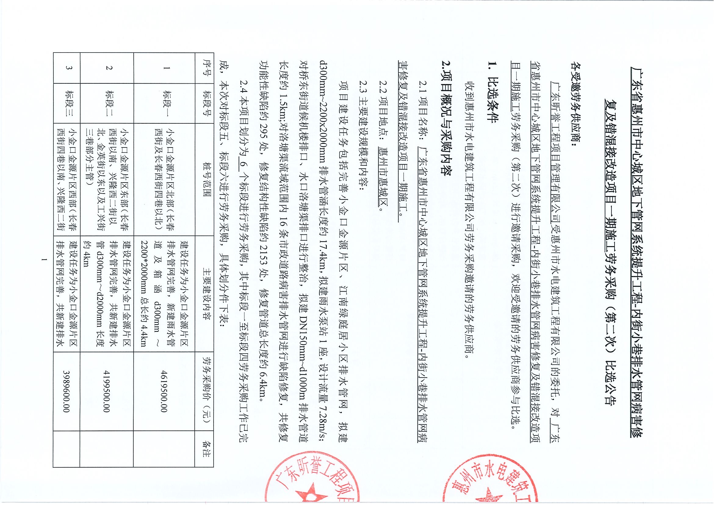 廣東省惠州市中心城區(qū)地下管網系統(tǒng)提升工程-內街小巷排水管網病害修復及錯混接改造項目一期施工勞務采購(第二次)比選公告