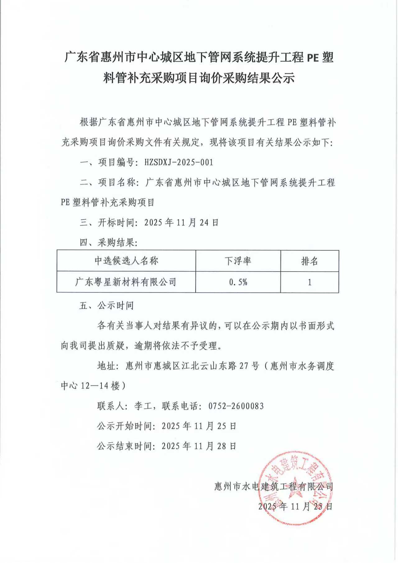 廣東省惠州市中心城區(qū)地下管網(wǎng)系統(tǒng)提升工程PE塑料管補充采購項目詢價采購結(jié)果公示