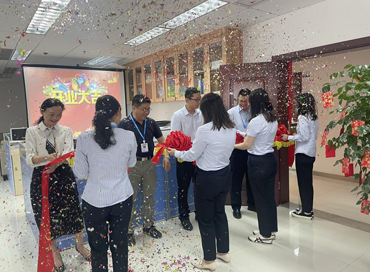 在參加儀式人員的共同見(jiàn)證下,鄭海強(qiáng)、黃敏、張敏、何品良共同為工貿(mào)公司剪彩和揭牌。
