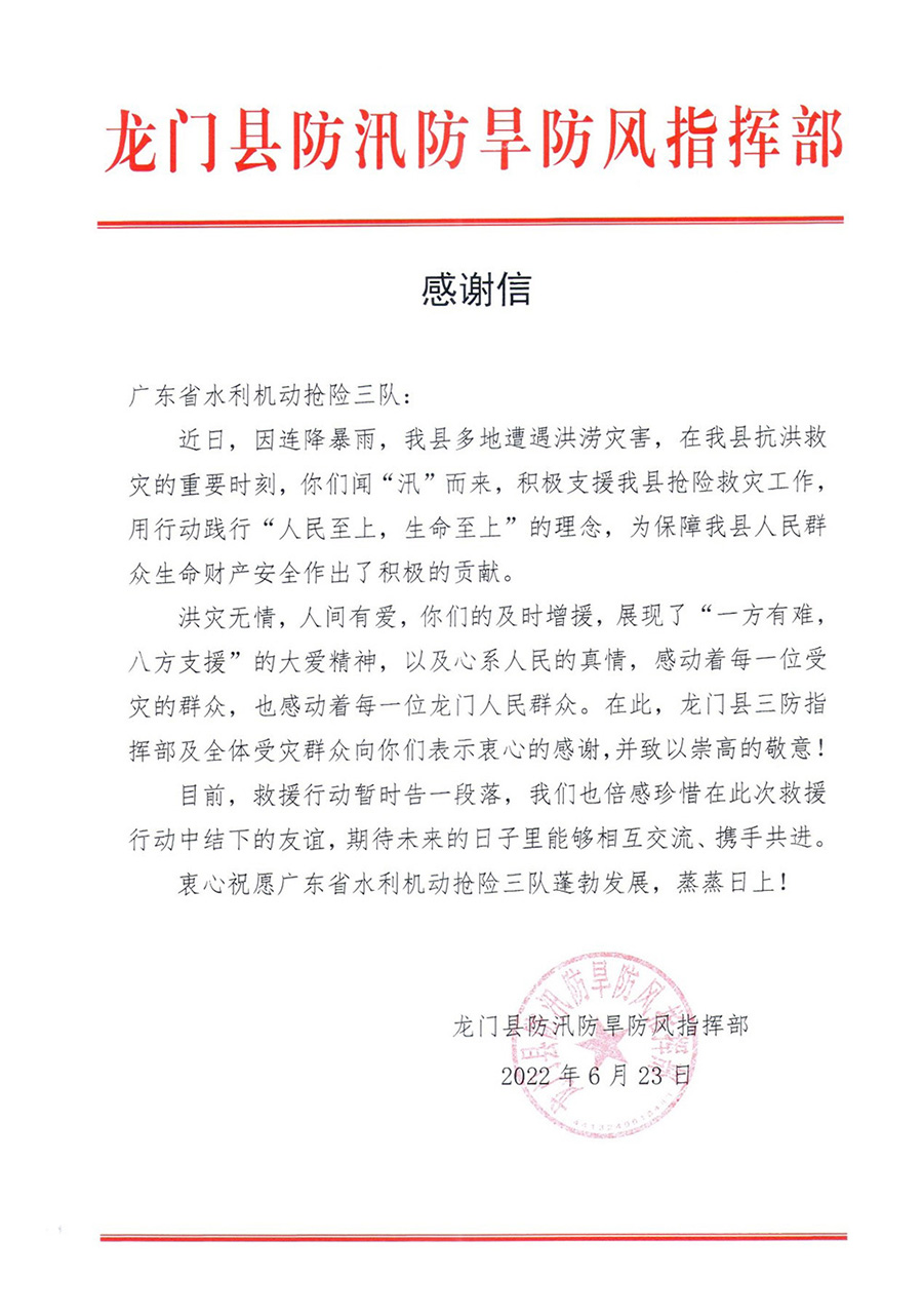 7月21日,我司(廣東省水利機動搶險三隊)收到龍門縣防汛防旱防風(fēng)總指揮部發(fā)來的感謝信,信中對我司在近期龍門縣多地洪澇災(zāi)害發(fā)生時,聞“汛”而來,積極支援參與搶險救災(zāi)工作,為保障龍門縣人民群眾生命財產(chǎn)安全作出的積極貢獻(xiàn)表示感謝。