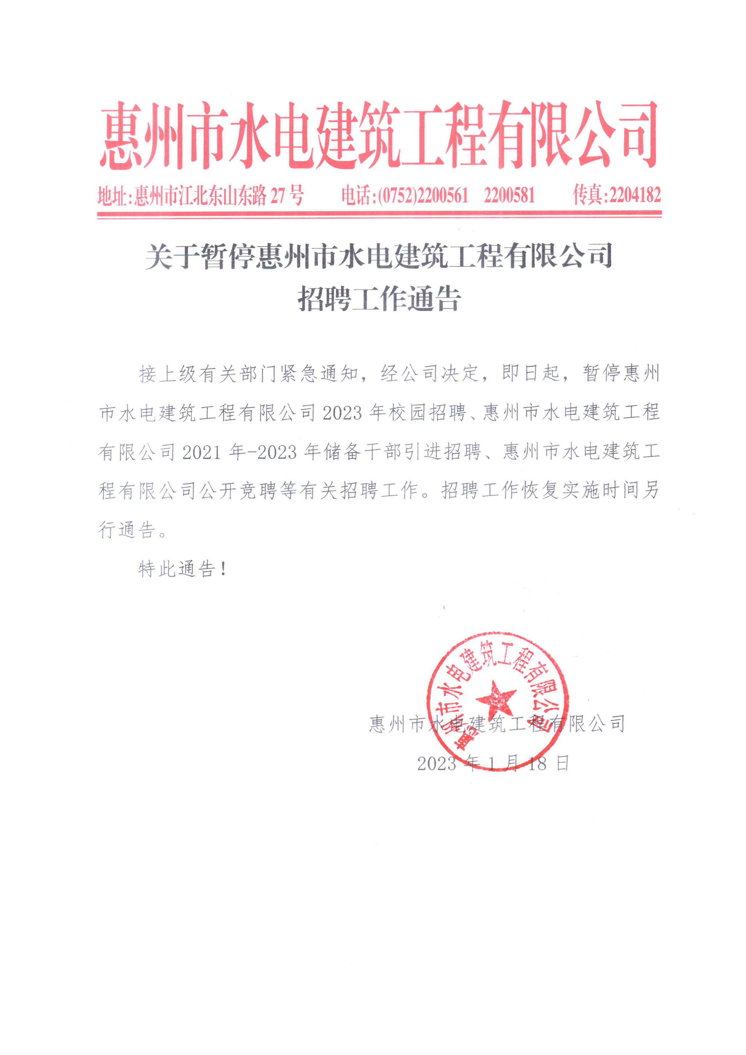 關于暫停惠州市水電建筑工程有限公司招聘工作的通告