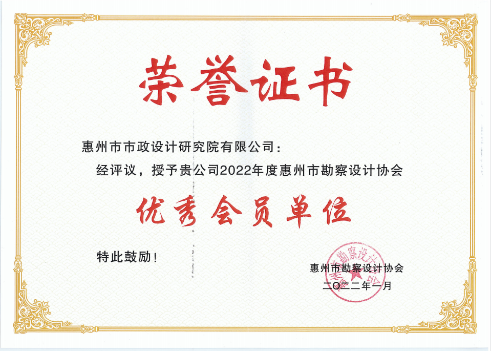 2023年2月8日,惠州市勘察設(shè)計(jì)協(xié)會五屆理事會第十二次會議在惠州市惠城區(qū)康帝酒店會議室召開,協(xié)會會長、監(jiān)事長以及理事、監(jiān)事單位等共30多人參加會議,大會頒發(fā)了2022年度惠州市勘察設(shè)計(jì)協(xié)會“優(yōu)秀會員單位”獎項(xiàng)榮譽(yù)證書,惠州市市政設(shè)計(jì)研究院有限公司榮獲協(xié)會“優(yōu)秀會員單位”稱號。