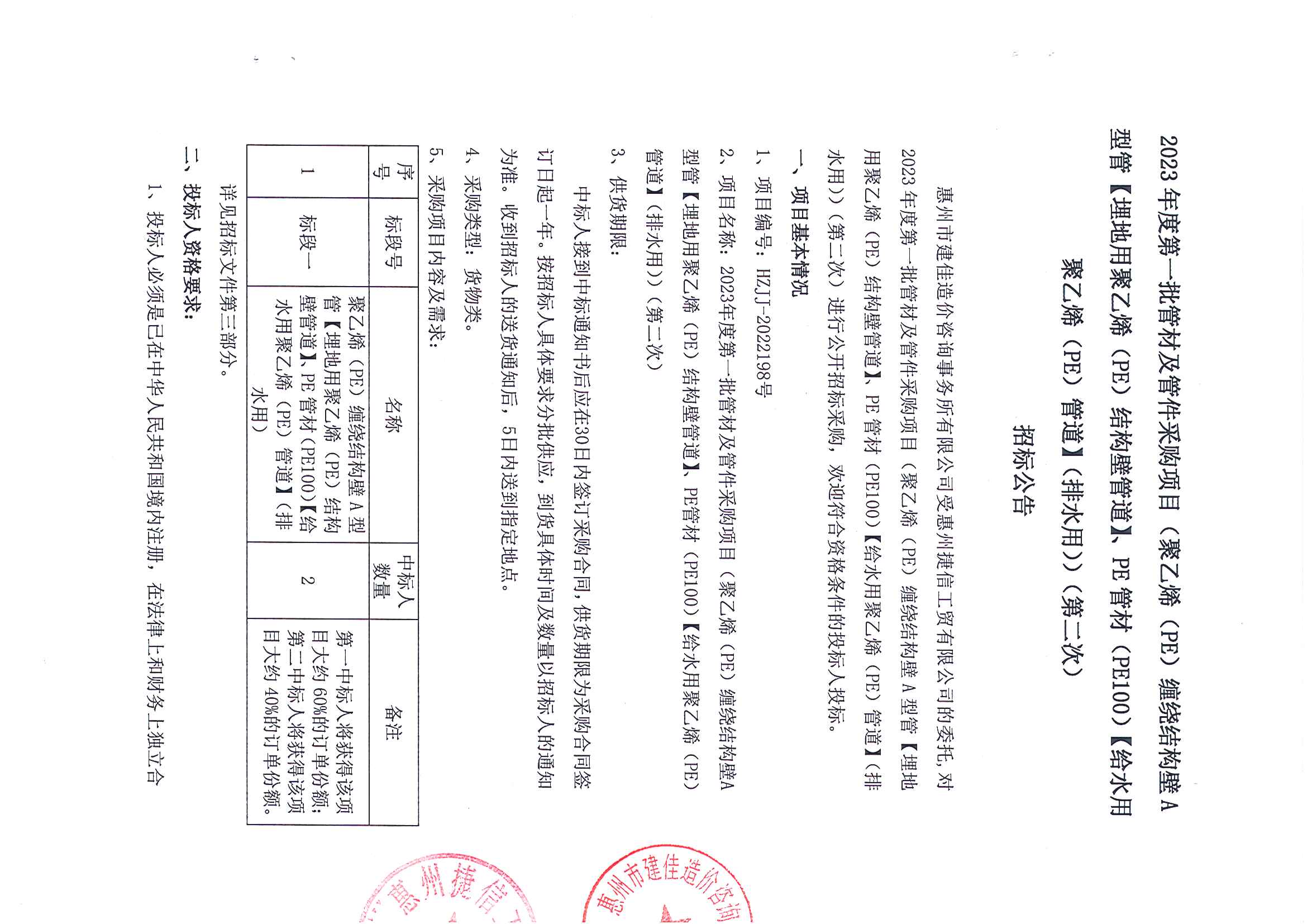 捷信工貿(mào)公司2023年度第一批管材及管件采購項(xiàng)目(標(biāo)段一)(第二次)招標(biāo)公告