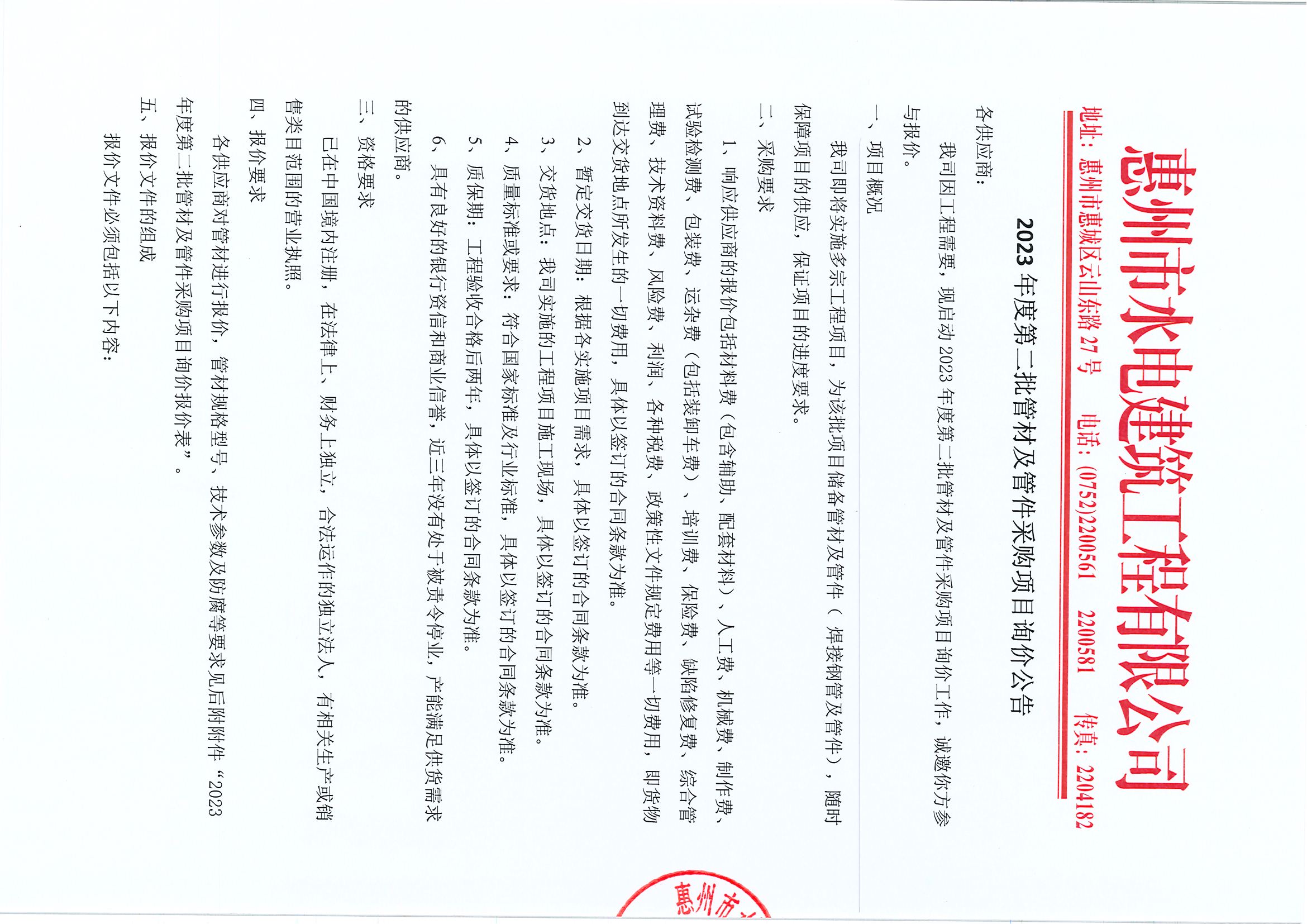 附件:2023年度第二批管材及管件采購項目詢價報價表