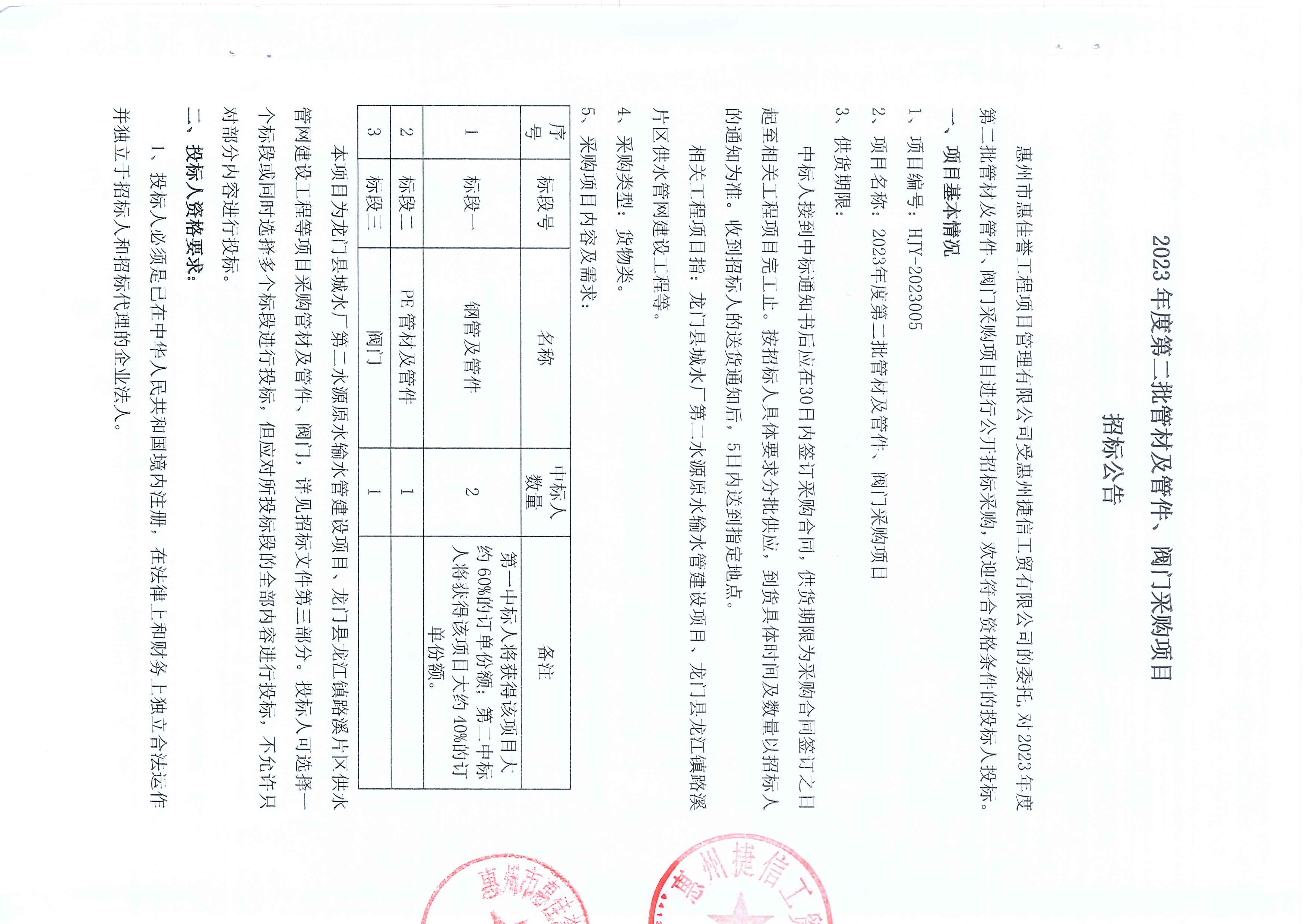捷信工貿(mào)公司2023年度第二批管材及管件、閥門采購項(xiàng)目招標(biāo)公告