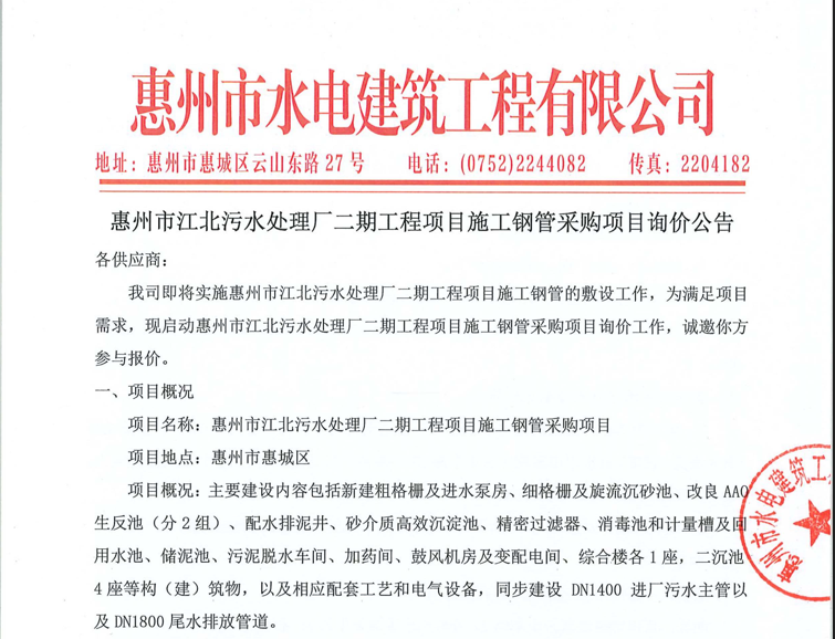 惠州市江北污水處理廠二期工程項(xiàng)目施工鋼管采購項(xiàng)目詢價(jià)公告......