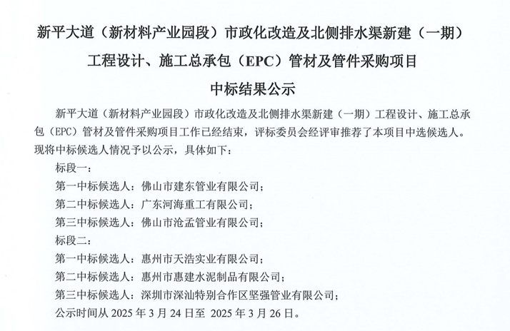 新平大道(新材料產(chǎn)業(yè)園段)市政化改造及北側(cè)排水渠新建(一期)工程設(shè)計(jì)、施工總承包(EPC)管材及管件采購項(xiàng)目中標(biāo)結(jié)果公示......