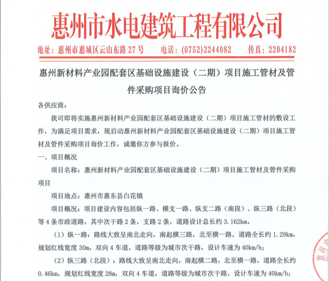 惠州新材料產(chǎn)業(yè)園配套區(qū)基礎(chǔ)設(shè)施建設(shè)(二期)項(xiàng)目施工管材及管件采購項(xiàng)目詢價(jià)公告......