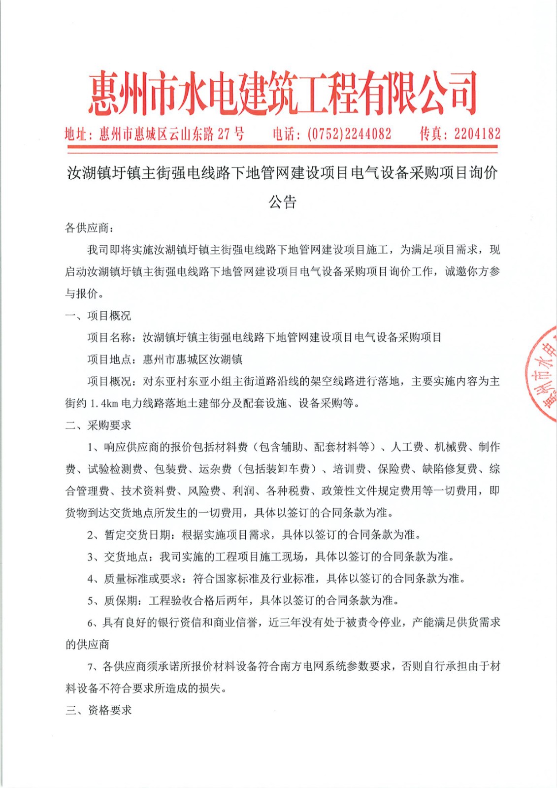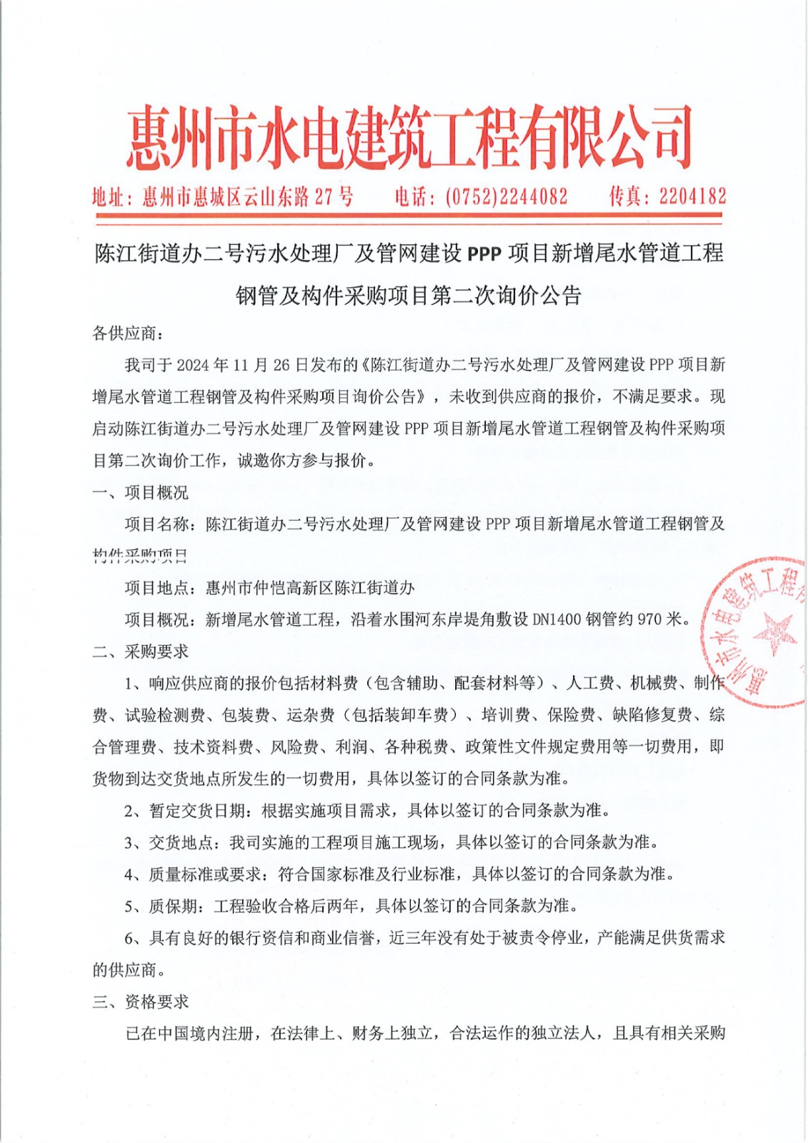 陳江街道辦二號污水處理廠及管網(wǎng)建設(shè)PPP項目新增尾水管道工程鋼管及構(gòu)件采購項目第二次詢價公告附件:/upload/202412/09/202412091458001110.xls......