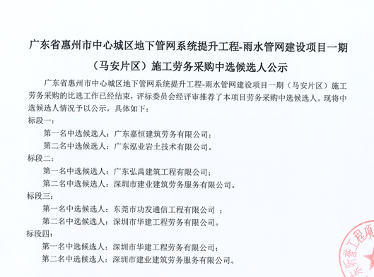 廣東省惠州市中心城區(qū)地下管網(wǎng)系統(tǒng)提升工程-雨水管網(wǎng)建設(shè)項(xiàng)目一期(馬安片區(qū))施工勞務(wù)采購(gòu)中選候選人公示......