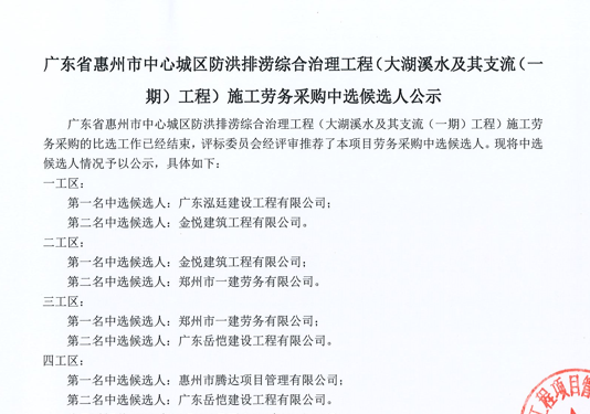 廣東省惠州市中心城區(qū)地下管網(wǎng)系統(tǒng)提升工程-高窟瀝流域排水管網(wǎng)完善項(xiàng)目施工勞務(wù)采購(gòu)中選候選人公示......