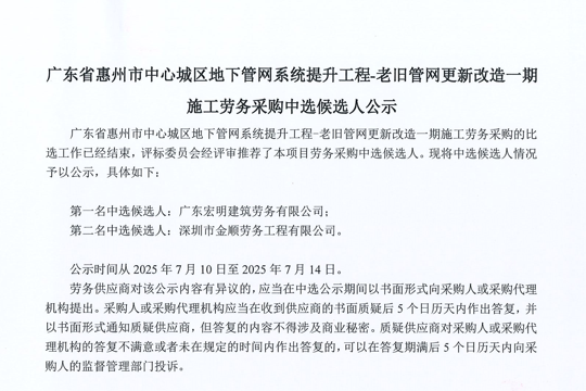 廣東省惠州市中心城區(qū)地下管網(wǎng)系統(tǒng)提升工程-老舊管網(wǎng)更新改造一期施工勞務(wù)采購(gòu)中選候選人公示......