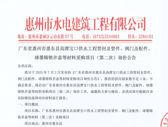 廣東省惠州市惠東縣高潭寶口供水工程施工管材及管件、閥門(mén)及配件、球墨鑄鐵井蓋等材料采購(gòu)項(xiàng)目(第二次)詢價(jià)公告......