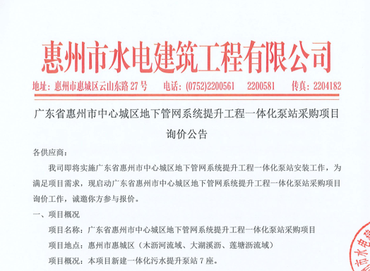 廣東省惠州市中心城區(qū)地下管網(wǎng)系統(tǒng)提升工程一體化泵站采購(gòu)項(xiàng)目詢價(jià)公告......