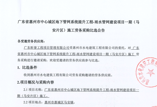 廣東省惠州市中心城區(qū)地下管網(wǎng)系統(tǒng)提升工程-雨水管網(wǎng)建設(shè)項目一期(馬安片區(qū))施工勞務(wù)采購比選公告......