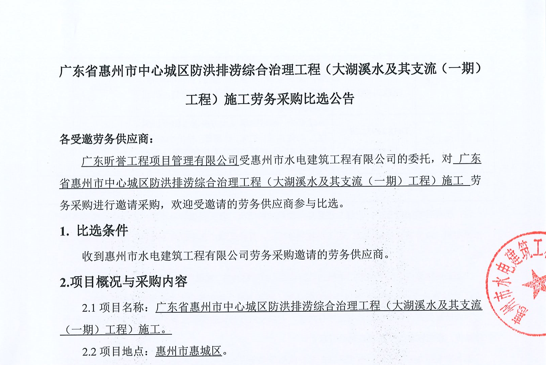 廣東省惠州市中心城區(qū)防洪排澇綜合治理工程(大湖溪水及其支流(一期)工程)施工勞務(wù)采購比選公告......