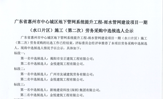 廣東省惠州市中心城區(qū)地下管網(wǎng)系統(tǒng)提升工程-雨水管網(wǎng)建設(shè)項目一期(水口片區(qū))施工(第二次)勞務(wù)采購中選候選人公示......