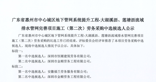 廣東省惠州市中心城區(qū)地下管網(wǎng)系統(tǒng)提升工程-大湖溪瀝、蓮塘瀝流域排水管網(wǎng)完善項目施工(第二次)勞務(wù)采購中選候選人公示......