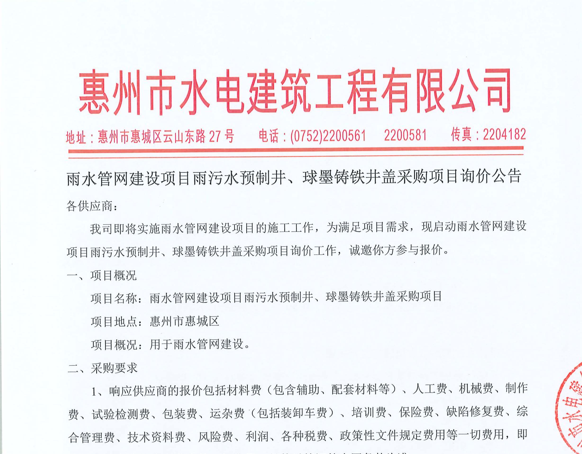 雨水管網(wǎng)建設(shè)項(xiàng)目雨污水預(yù)制井、球墨鑄鐵井蓋采購項(xiàng)目詢價(jià)公告......