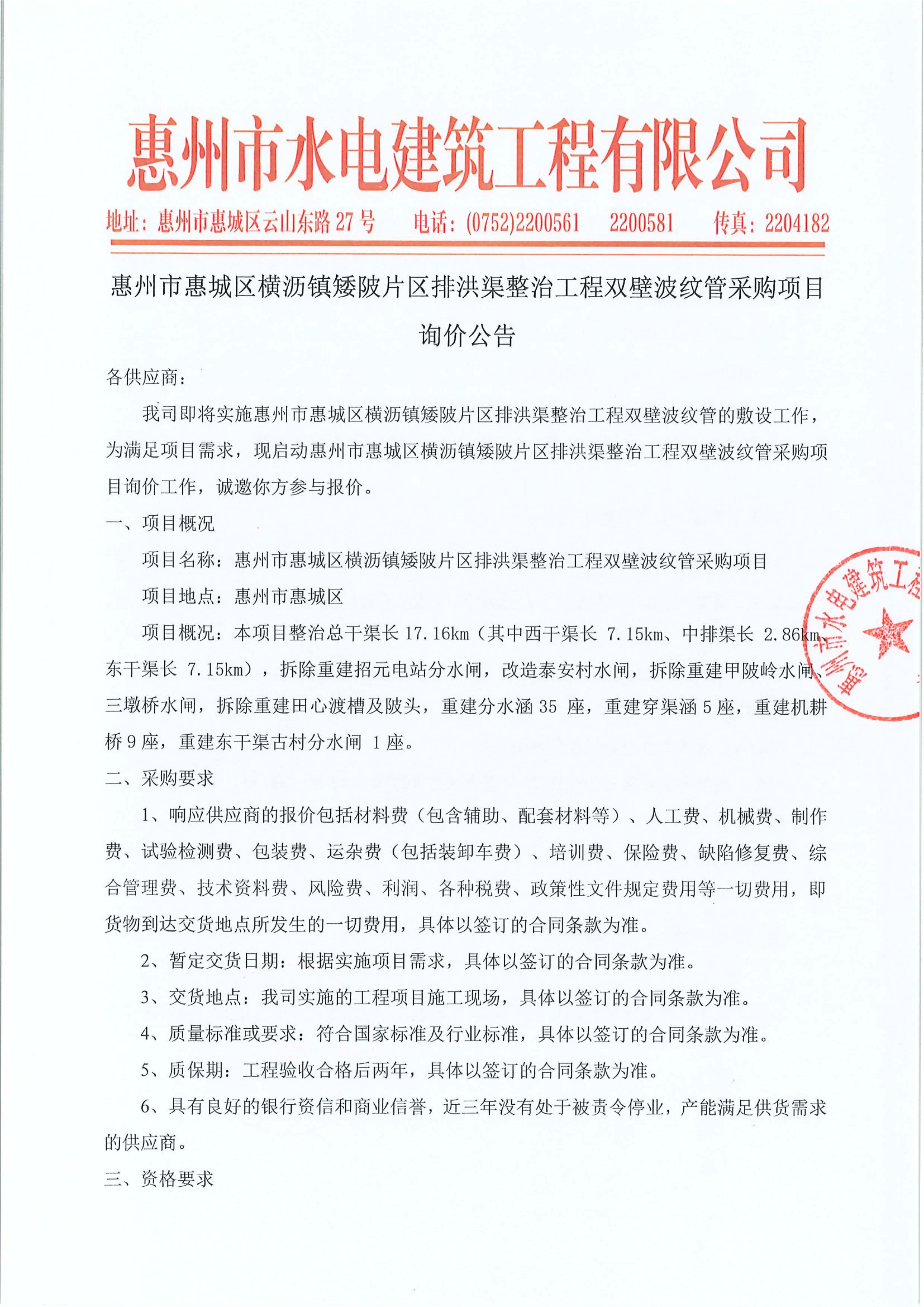 惠州市惠城區(qū)橫瀝鎮(zhèn)矮陂片區(qū)排洪渠整治工程雙壁波紋管采購項目詢價公告