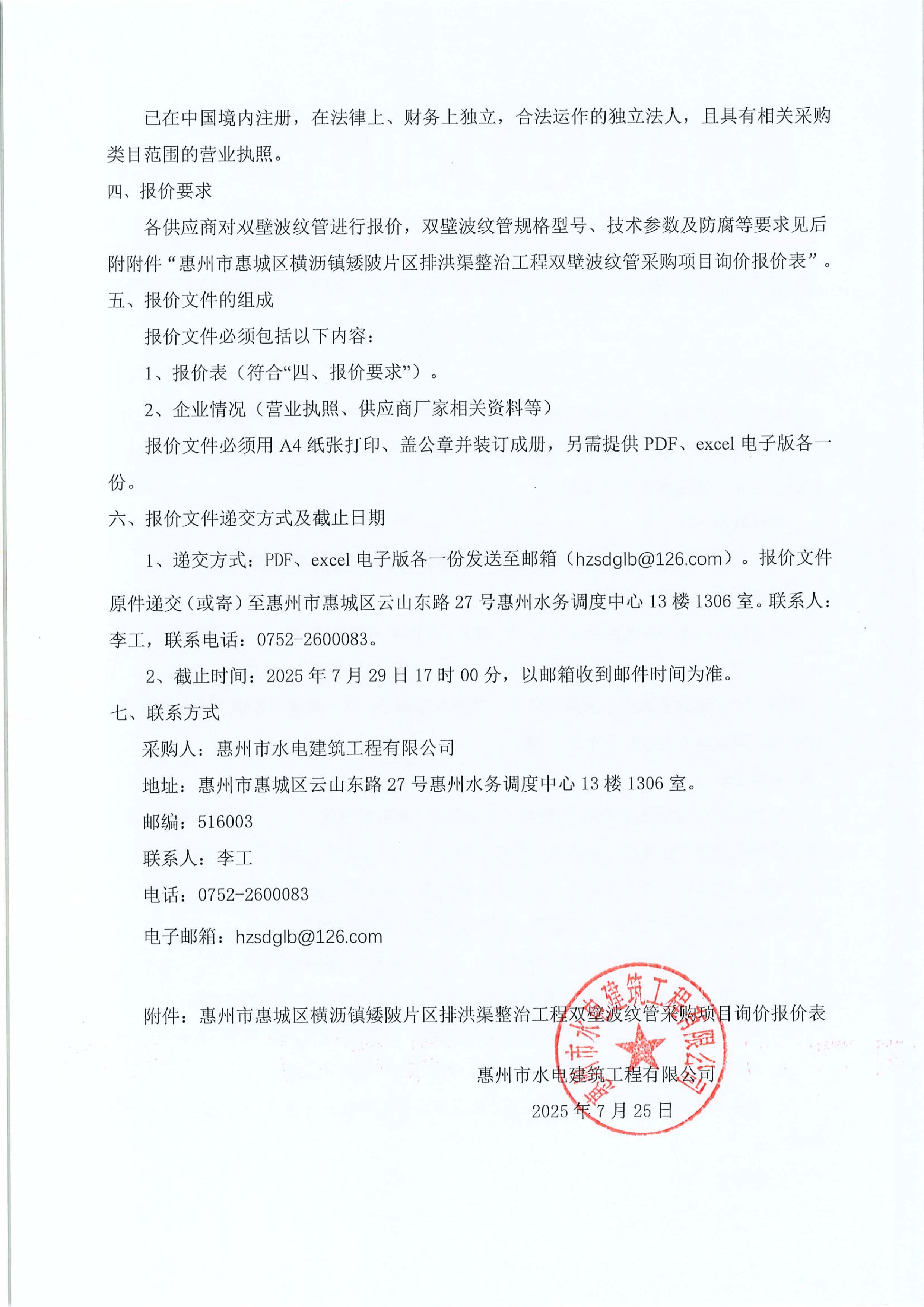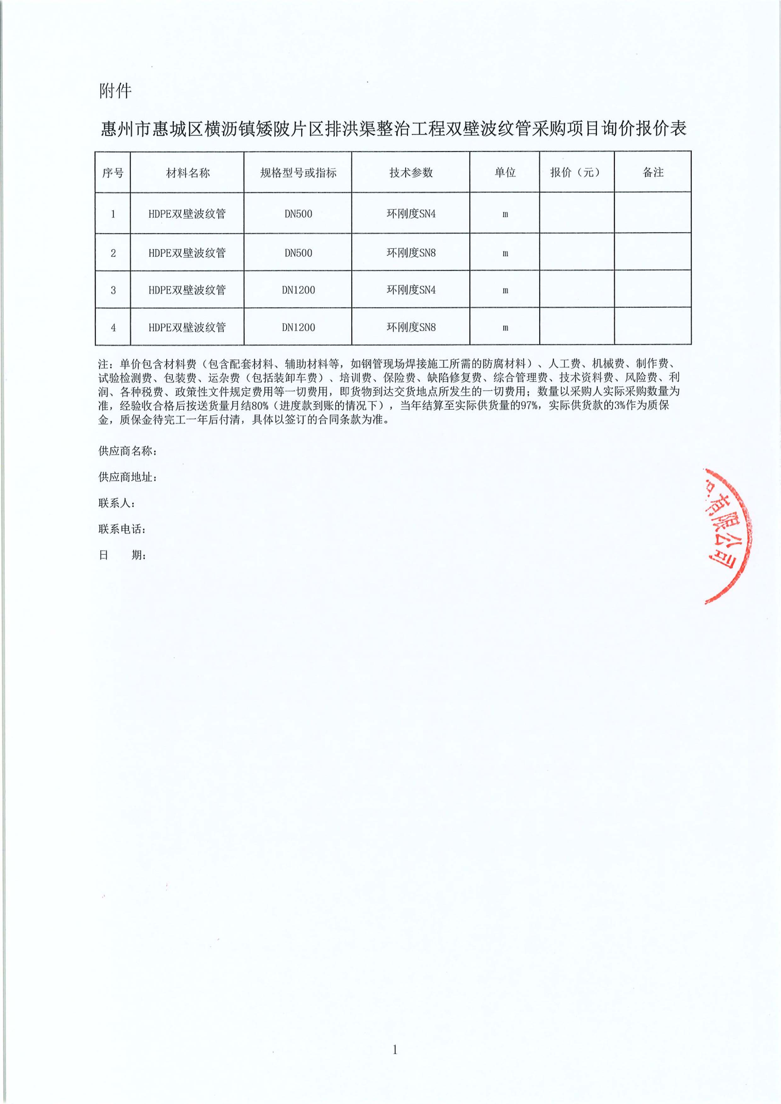 惠州市惠城區(qū)橫瀝鎮(zhèn)矮陂片區(qū)排洪渠整治工程雙壁波紋管采購項目詢價公告附件: