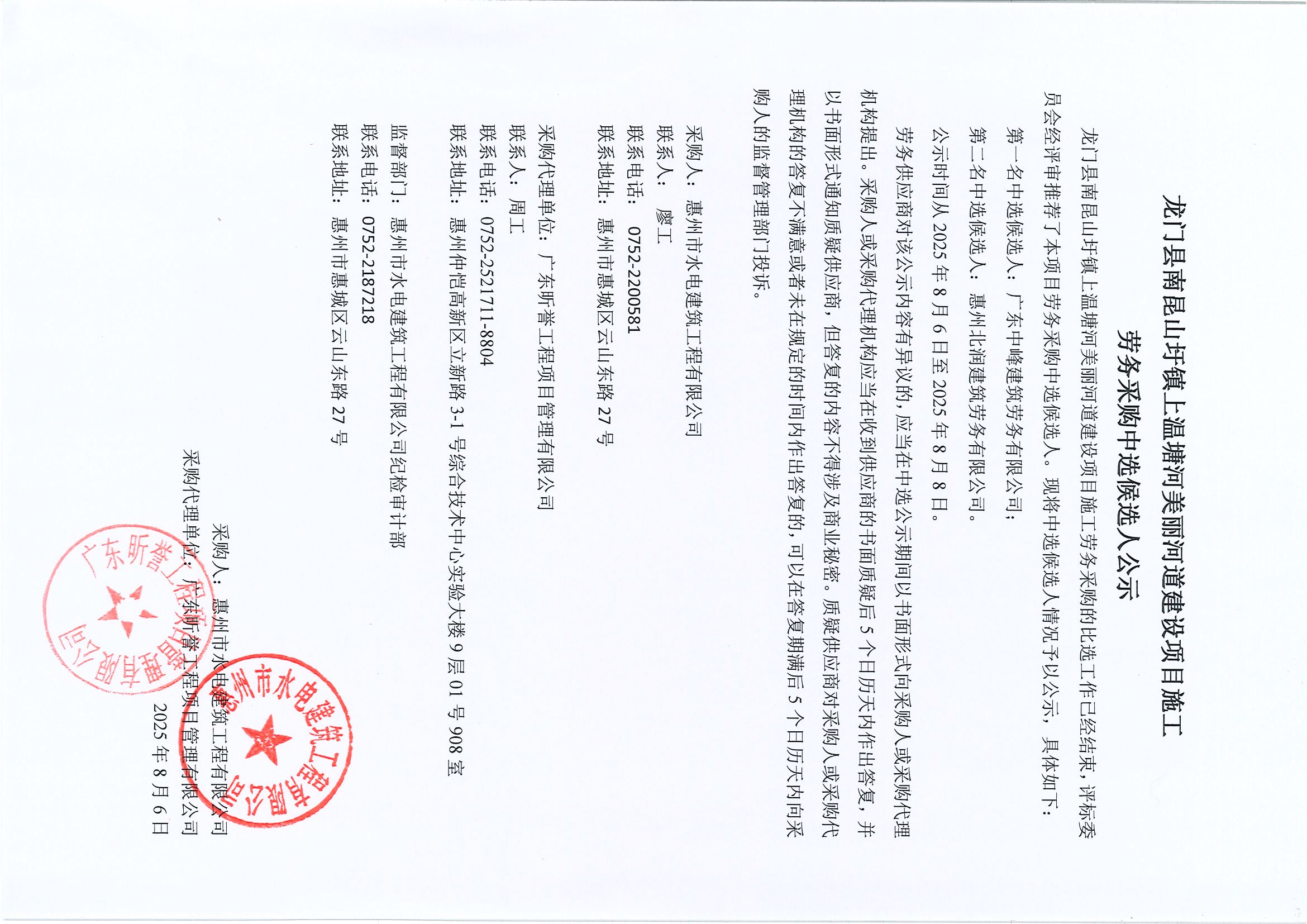 博羅縣河肚水水系綜合整治工程和博羅縣瀾石河水系綜合整治工程施工勞務(wù)采購中選候選人公示