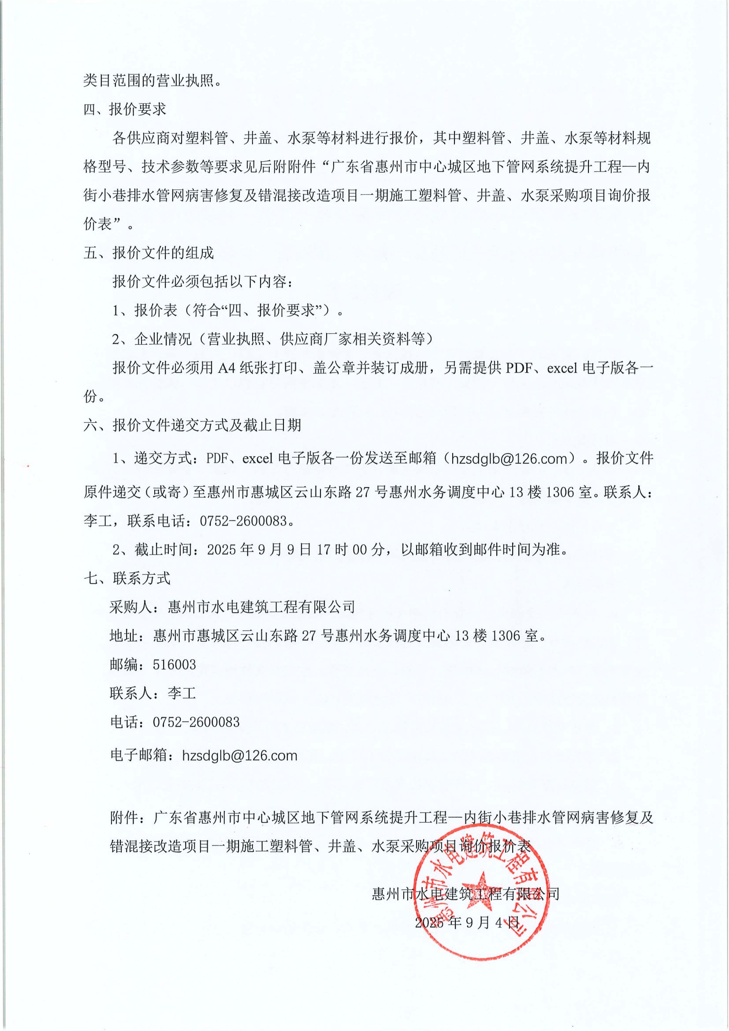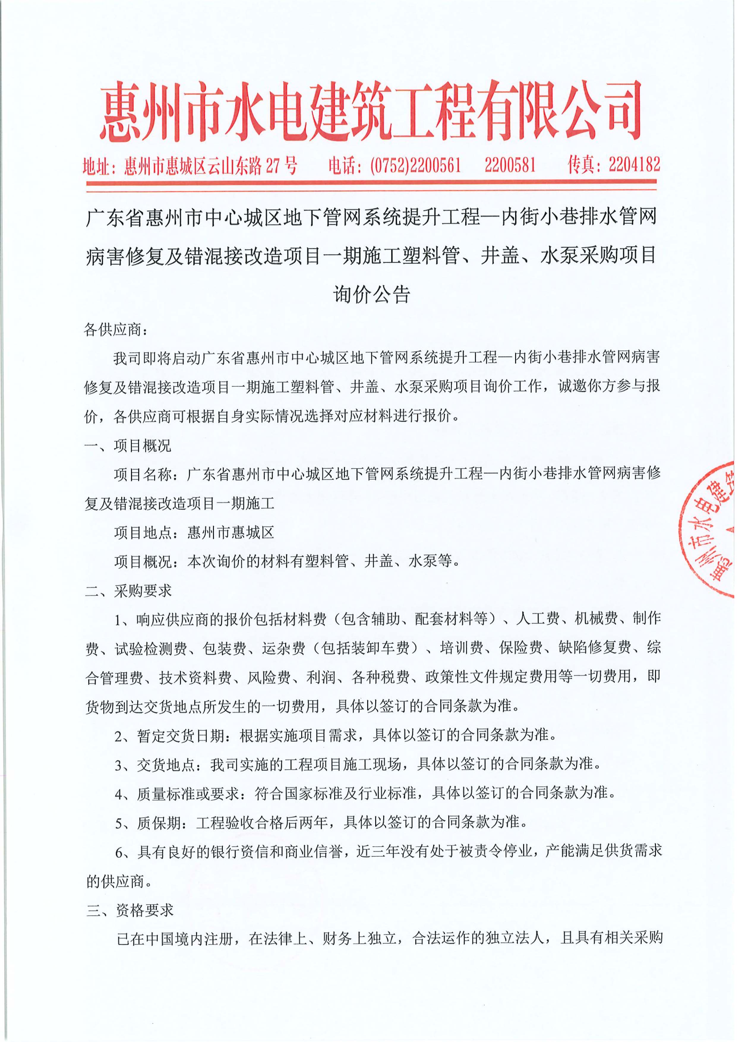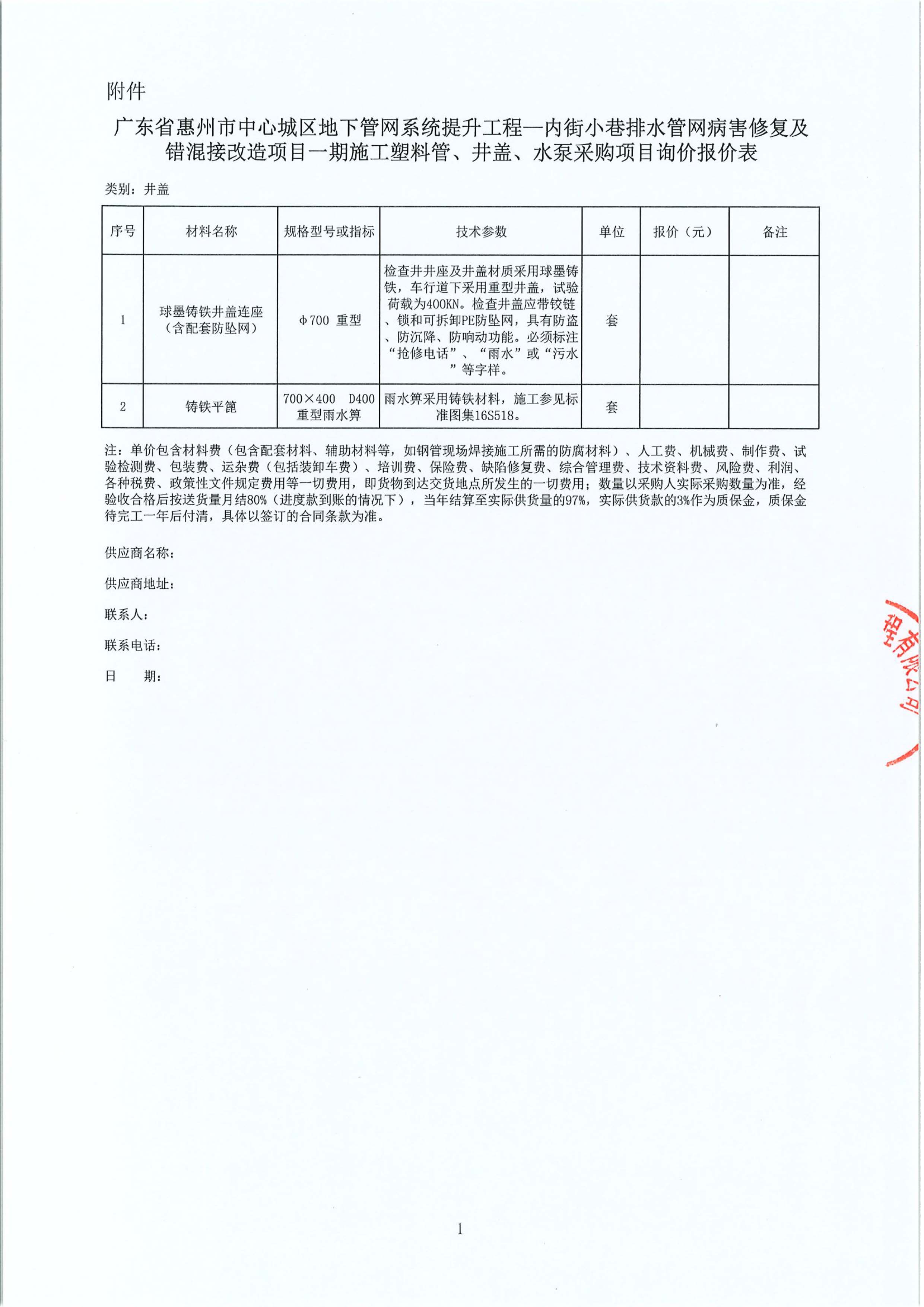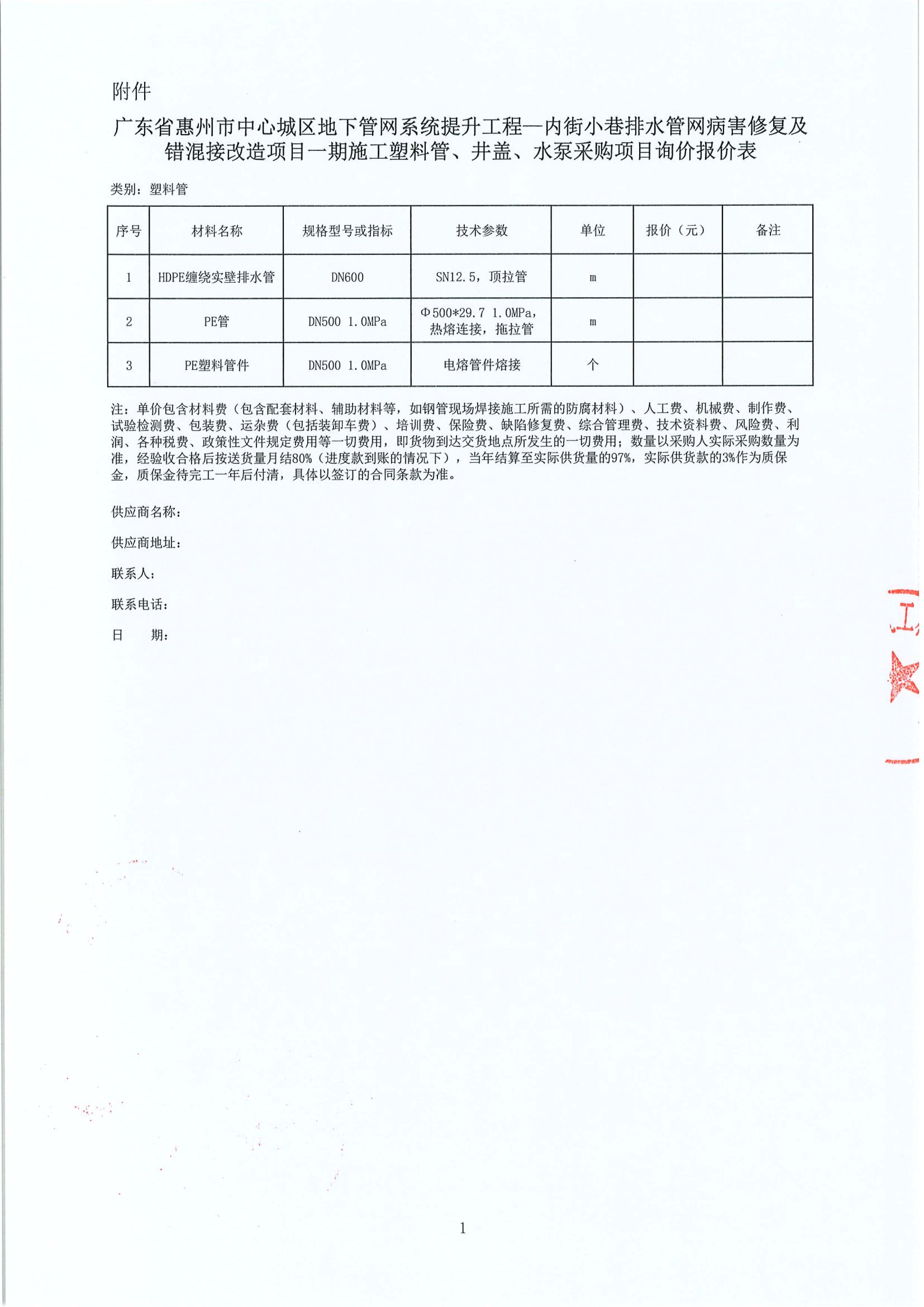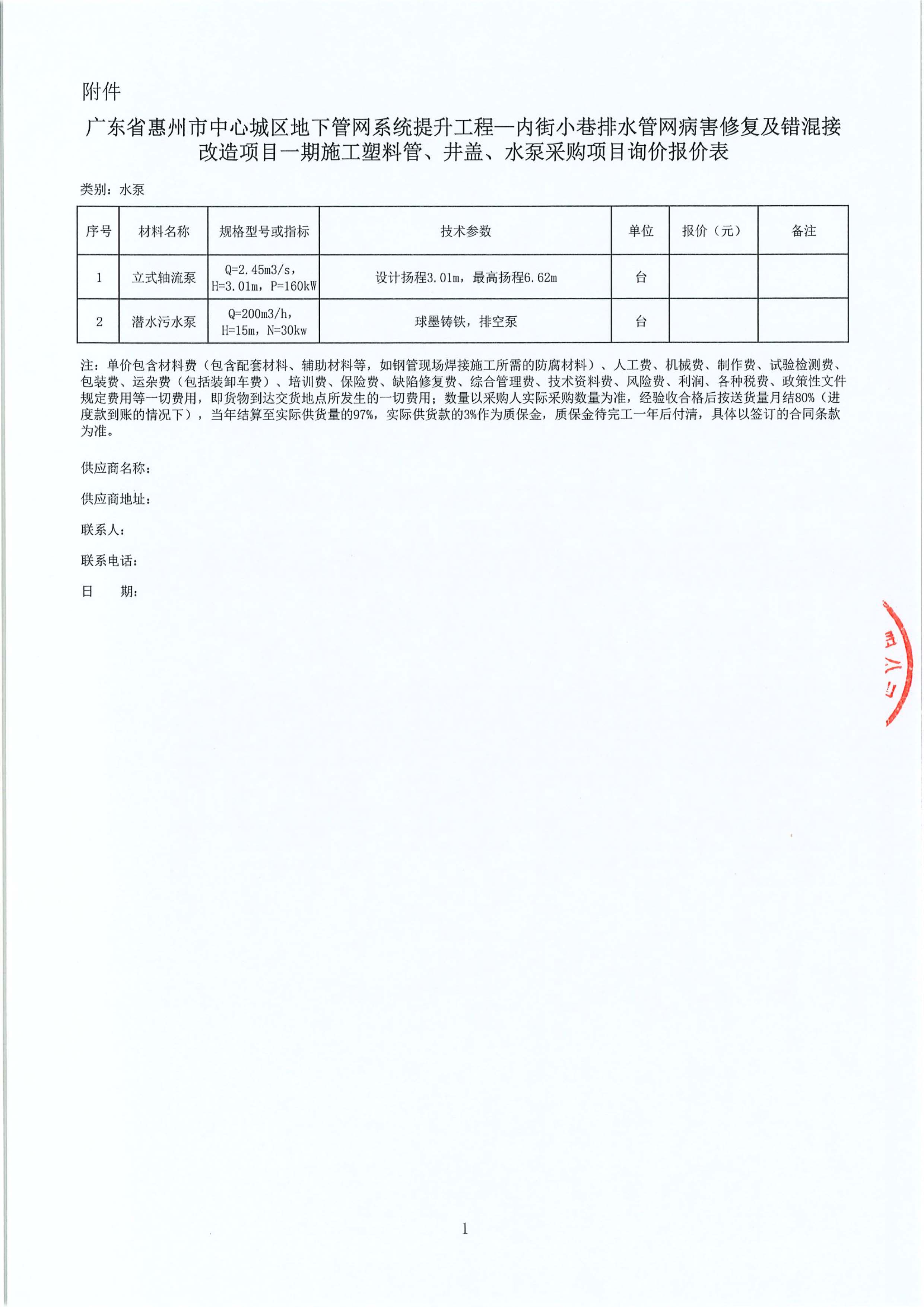 廣東省惠州市中心城區(qū)地下管網(wǎng)系統(tǒng)提升工程—內(nèi)街小巷排水管網(wǎng)病害修復(fù)及錯(cuò)混接改造項(xiàng)目一期施工塑料管、井蓋、水泵采購項(xiàng)目詢價(jià)公告附件: