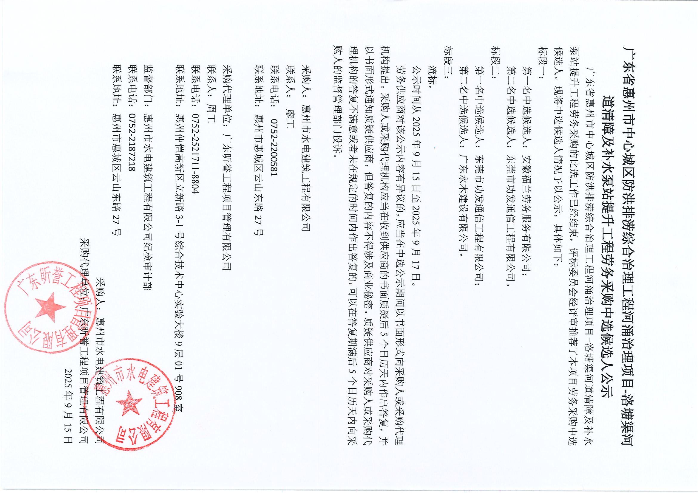 廣東省惠州市中心城區(qū)防洪排澇綜合治理工程河涌治理項目-洛塘渠河道清障及補水泵站提升工程勞務采購中選候選人公示
